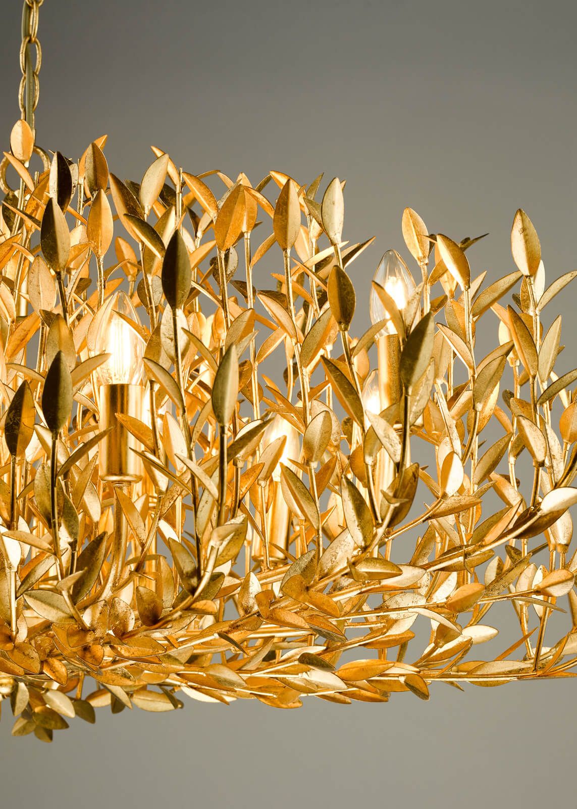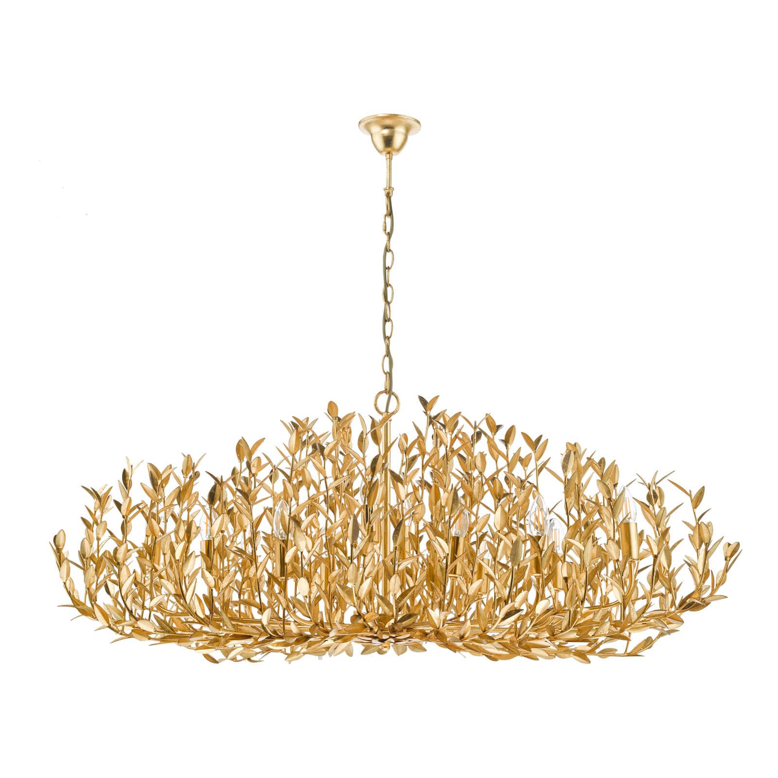 Introducing the Silvius 12 Light Oval Chandelier in Antique Gold Leaf, a true masterpiece that captures the organic elegance of an olive tree. Meticulously handcrafted, this exquisite chandelier boasts hundreds of metal leaves and stems meticulously formed to mimic nature's beauty. Each branch is then adorned with gold leaf, a meticulous process that culminates in a glistening antique finish. The result is a statement piece that seamlessly marries natural inspiration with artistic craftsmanship. With its oval design, the Silvius chandelier adds a touch of grandeur to any space. Suspended from a sturdy chain, this captivating chandelier creates a dramatic focal point. Illuminate your space with twelve E14 (SES) candle bulbs (bulbs not included), and experience the mesmerizing play of light and shadow. Whether it graces your living room, dining area, or entryway, the Silvius 12 Light Oval Chandelier exudes timeless sophistication. Elevate your interior with this remarkable blend of artistry and illumination. To enhance energy efficiency and lighting quality, we recommend opting for LED bulbs from our range of LED bulbs.