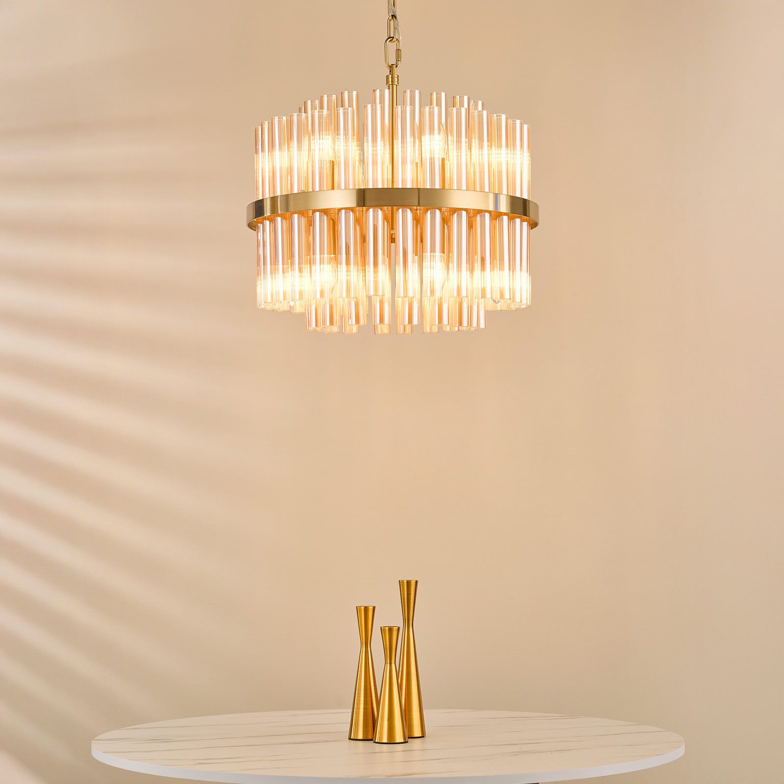 The Imani 12 light pendant in natural brass and amber glass brings warmth and understated luxury to modern interiors. Oversized ribbed amber glass rods encircle a refined brass ring, diffusing a soft, inviting glow with subtle architectural presence. The polished brass interior enhances the illumination, creating the impression of floating glass and adding depth to the design. Suspended on a 1.5m chain for adjustable height, this statement pendant is perfect for dining rooms, lounges, or hallways where both impact and elegance are desired.