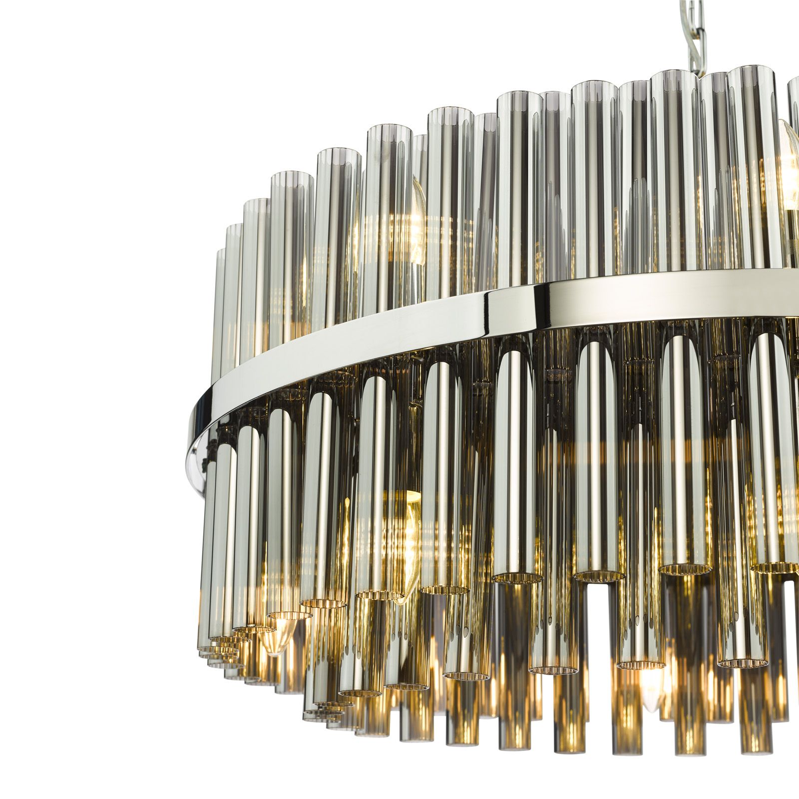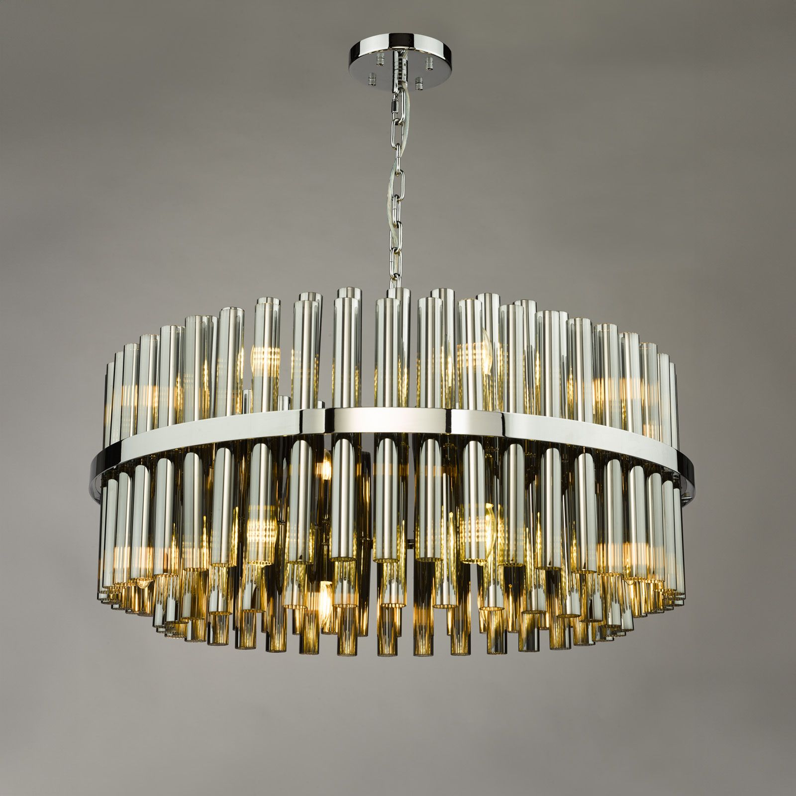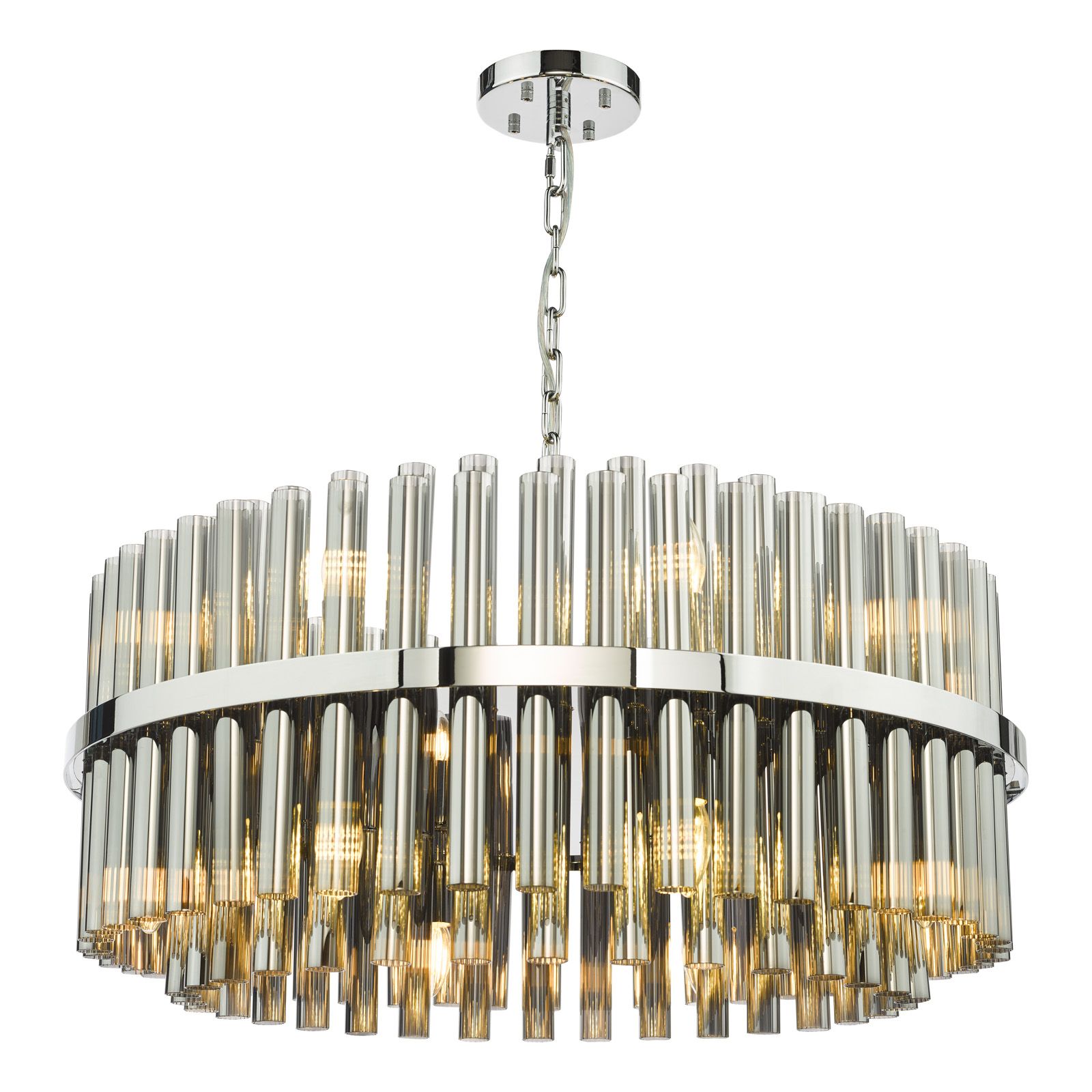 The Imani 16 light pendant in polished chrome and smoked glass is a dramatic statement piece for contemporary interiors. Oversized ribbed smoked glass rods form a striking display around a sleek chrome frame, casting a soft yet sophisticated glow. The polished chrome interior enhances the reflections, balancing depth with crisp modern elegance. Suspended from a 1.5m chain, this impressive pendant is height adjustable on installation and perfectly suited to high ceilings or larger spaces in need of a strong focal point. Ideal for dining rooms, lounges, or grand hallways, the Imani 16 light pendant combines bold design with refined luxury.