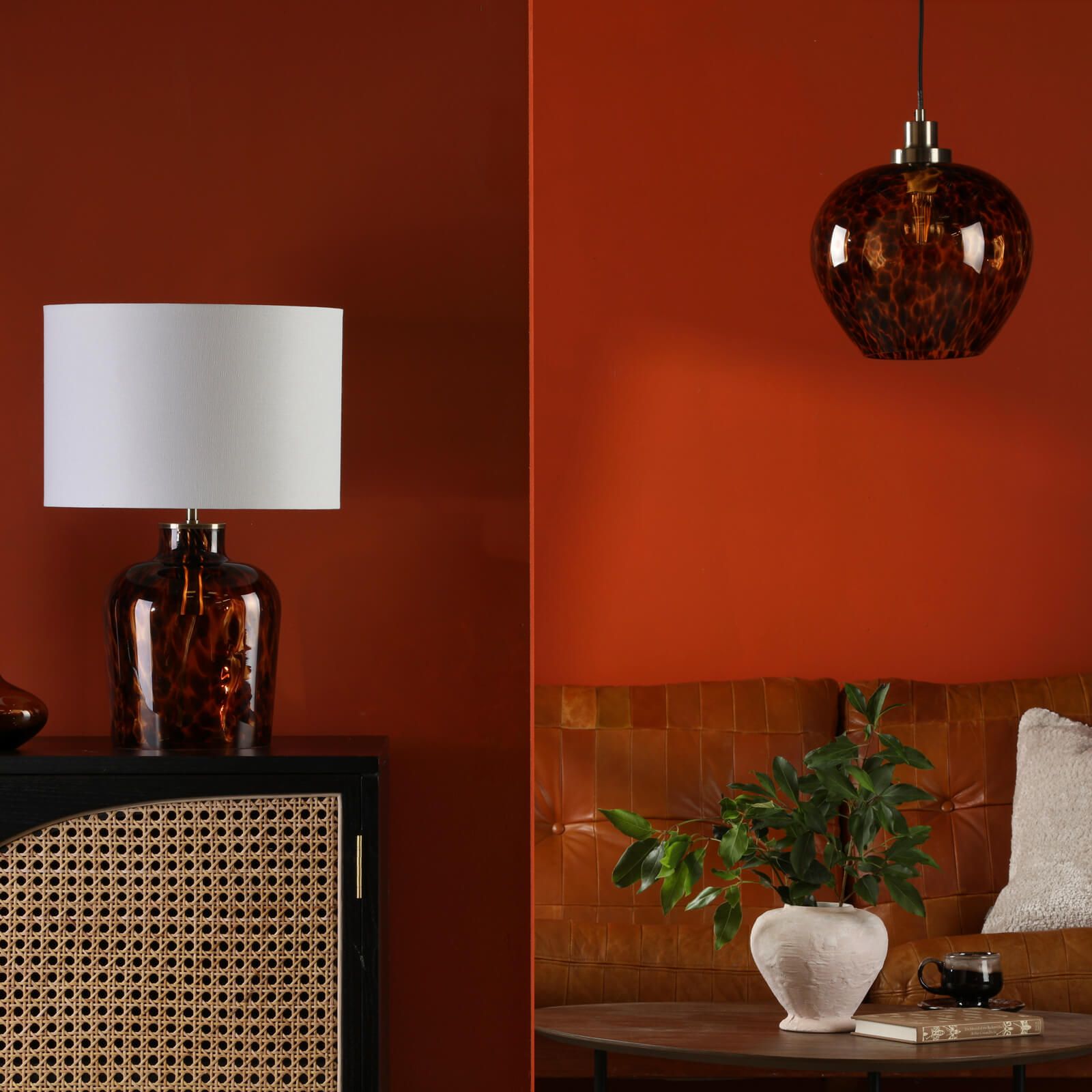 Create an inviting, cosy ambiance in any space with the Leandra Pendant. Handcrafted with skill, this pendant features a hand-blown tortoiseshell glass shade that casts warm, amber-toned rays throughout the room. An antique brass finish on the frame complements the glass with a touch of vintage sophistication. The Leandra Pendant's versatile design suits living rooms, dining areas, and bedrooms alike - offering both style and functional lighting for your home.
