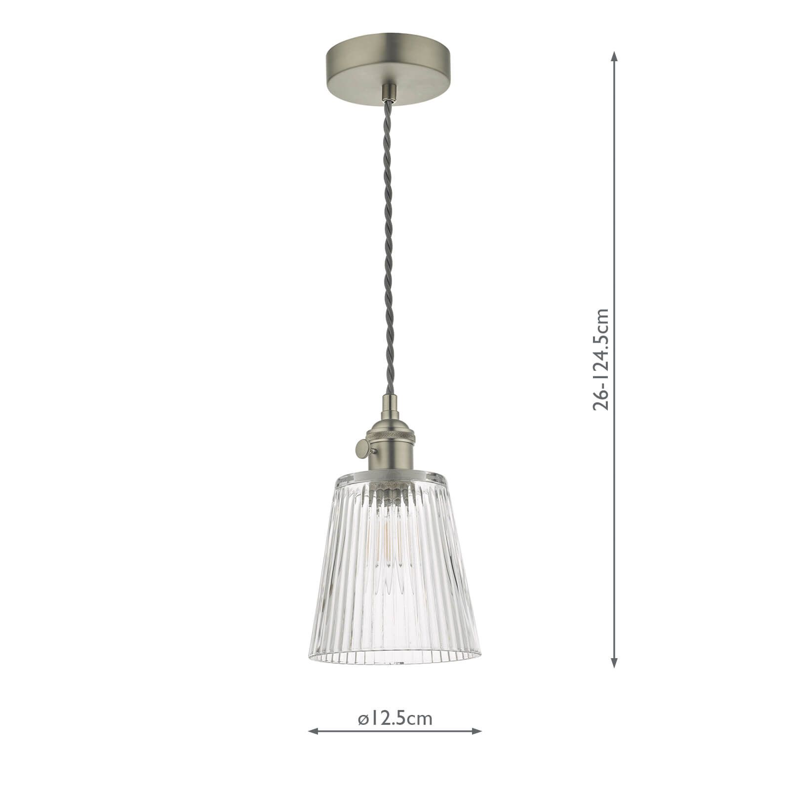 This version has a vintage-look straight-sided jar shade in waterfall ribbed glass, complemented by a sophisticated antique chrome ceiling rose and lamp holder.