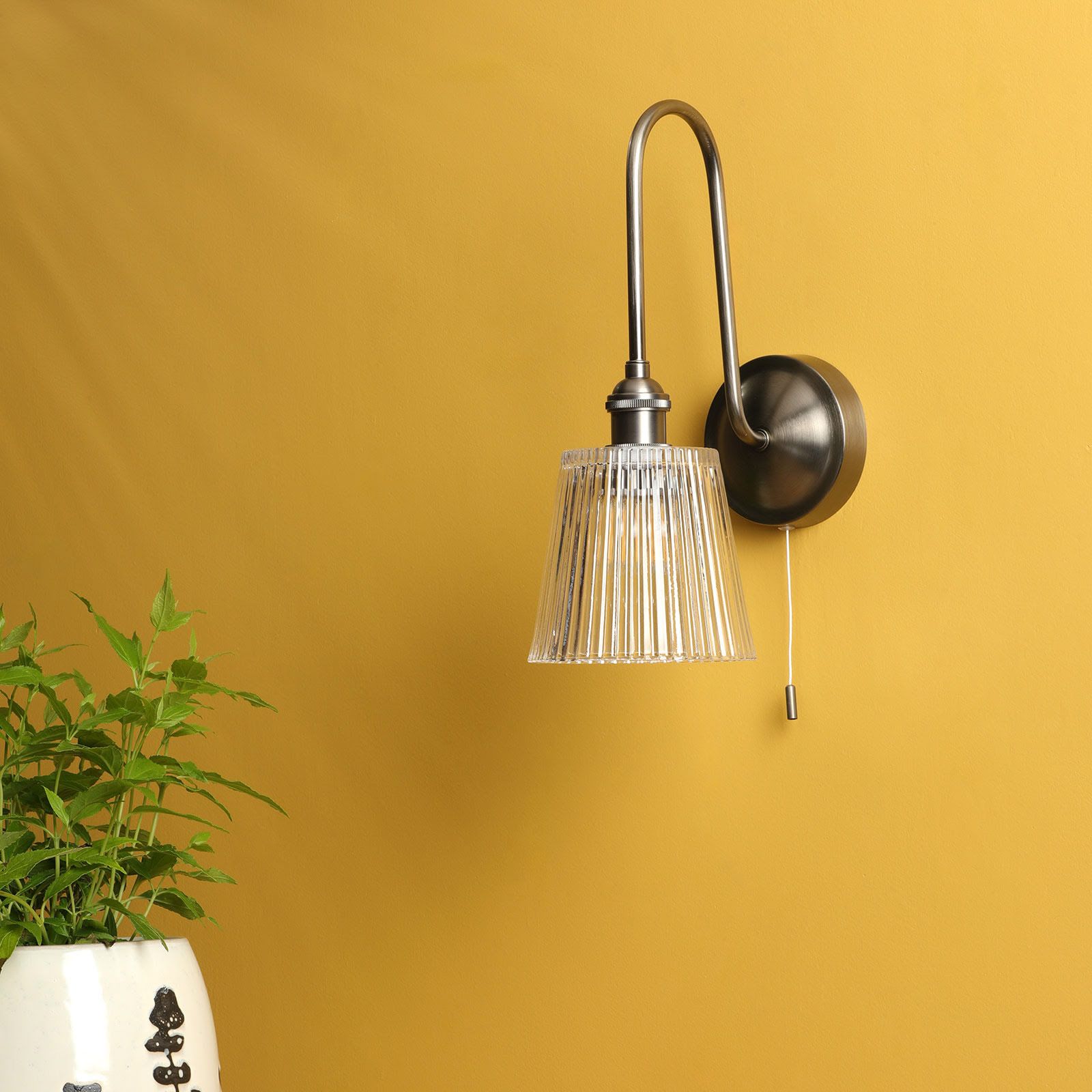 This Tall Wall Light Bracket from the Hadano range blends heritage style with modern versatility. Crafted from steel in an antique chrome finish with vintage detailing, it comes complete with an Easy Fit clear ribbed glass shade that diffuses the light with subtle texture and elegance. A matching ball-and-chain pull cord switch adds charm and practicality, and can be removed at installation if preferred. Its slender curved arm holds an E14 lampholder, creating a graceful, understated profile. Perfect for living rooms, dining areas, bedrooms, kitchens, halls, or stairwells, the Hadano Wall Light delivers timeless style and versatile functionality.
