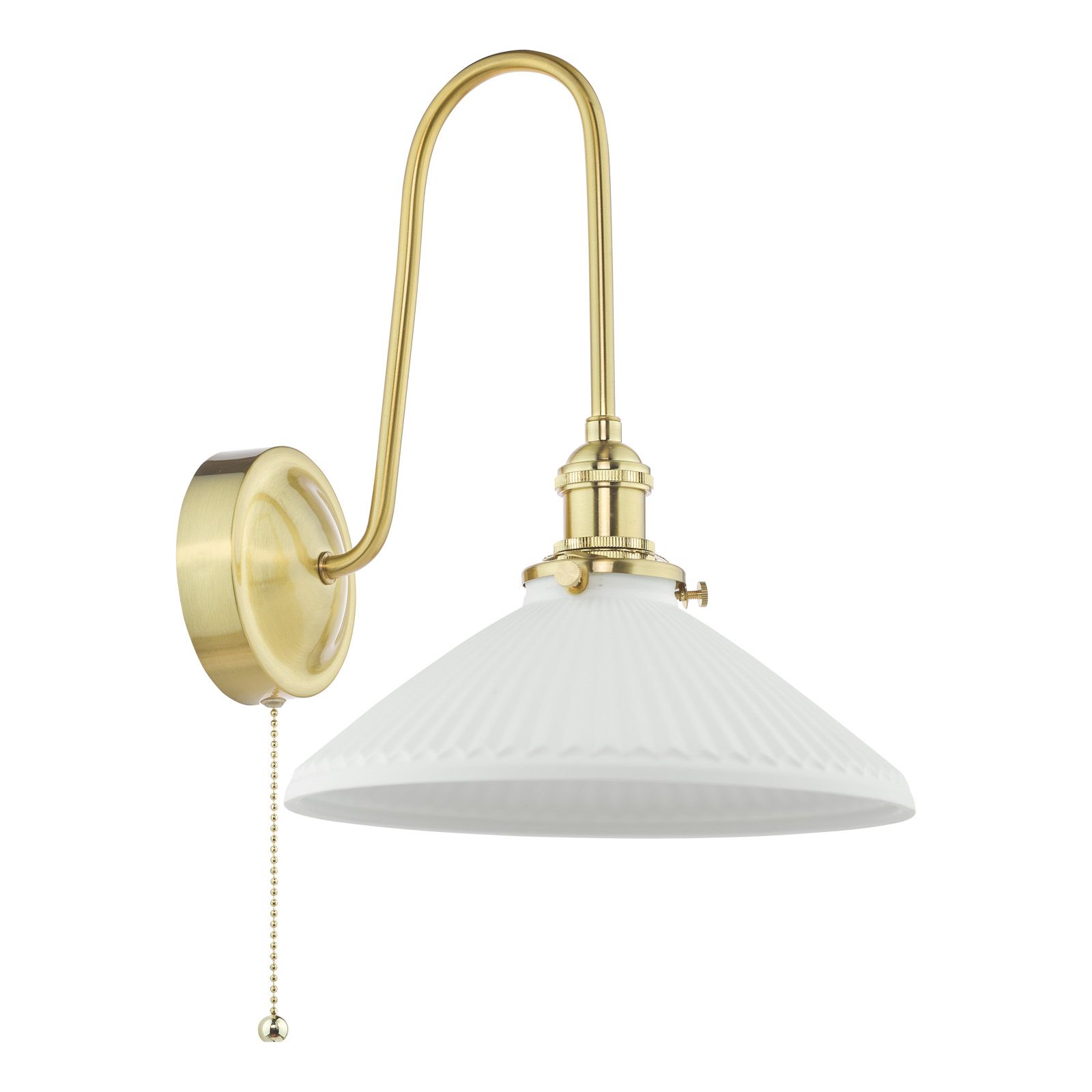 This Tall Wall Light Bracket from the Hadano range blends heritage style with modern versatility. Crafted from steel in a warm brass finish with vintage detailing, it comes complete with an Easy Fit white shallow ceramic shade that adds a refined, timeless accent. A matching ball-and-chain pull cord switch provides charm and practicality, and can be removed at installation if preferred. Its slender curved arm holds an E14 lampholder, creating an elegant, understated profile. Perfect for living rooms, dining areas, bedrooms, kitchens, halls, or stairwells, the Hadano Wall Light delivers enduring style and versatile functionality.