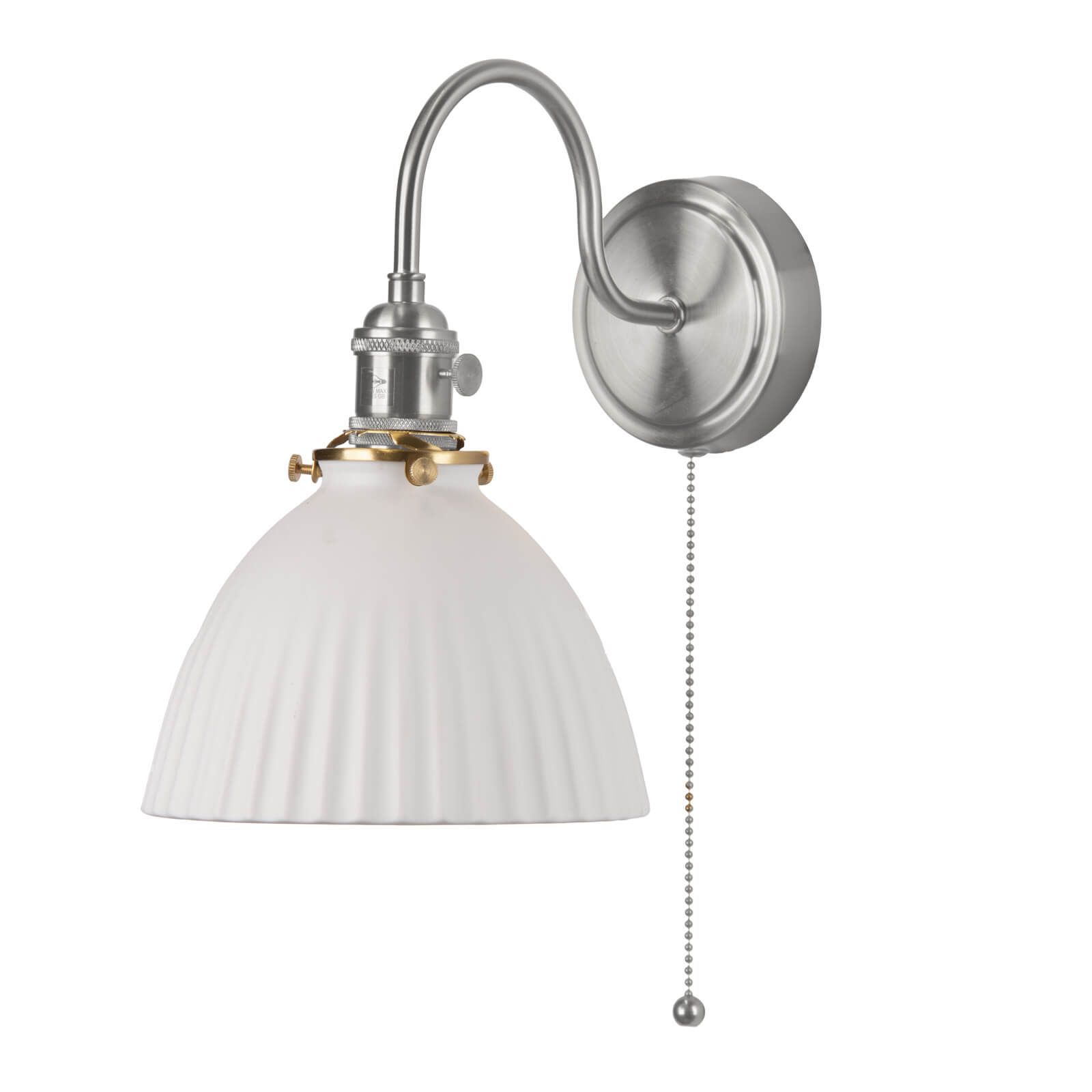 The Hadano Wall Light Antique Chrome & Ceramic Domed Shade is a beautiful wall light with a fine ribbed white ceramic shade and antique chrome frame. When lit, the shade gives off a lovely warm glow that evokes images of country farms and vintage kitchens. The pull cord switch is hidden behind the fixture, allowing you to turn the light on and off with ease. The Hadano wall light features a simple yet stylish design that would look great in a hallway, kitchen or dining room.