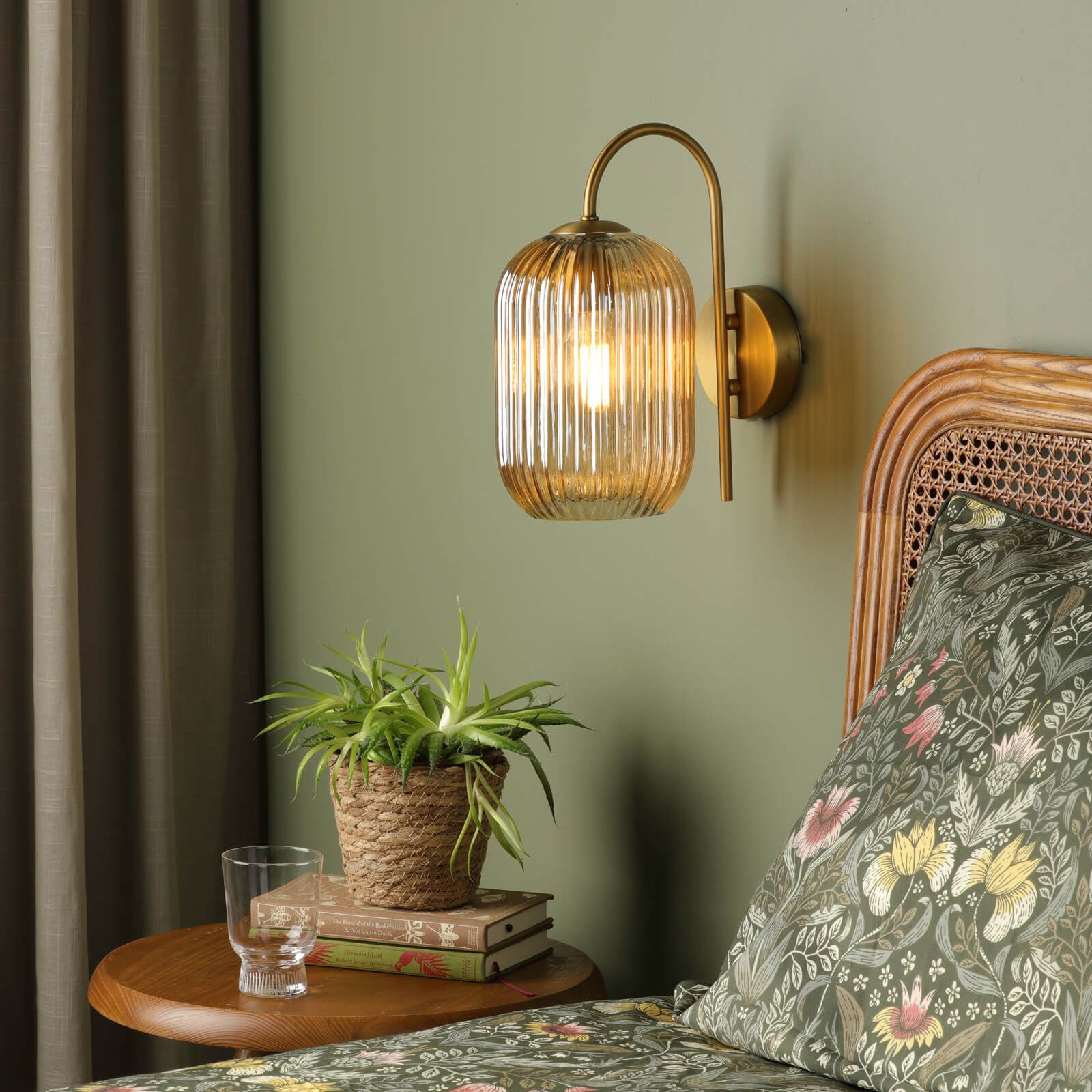 The Idra Wall Light Aged Bronze and Champagne Ribbed Glass is an elegant wall light with an oversized J-arm that allows it to be used as a pair or on its own. The Idra wall light features a pull cord switch and is made from metal with an aged bronze finish. The glass shade is champagne ribbed glass which diffuses the light from a single bulb. The Idra wall light is designed to complement modern homes with its minimalist yet stylish design.