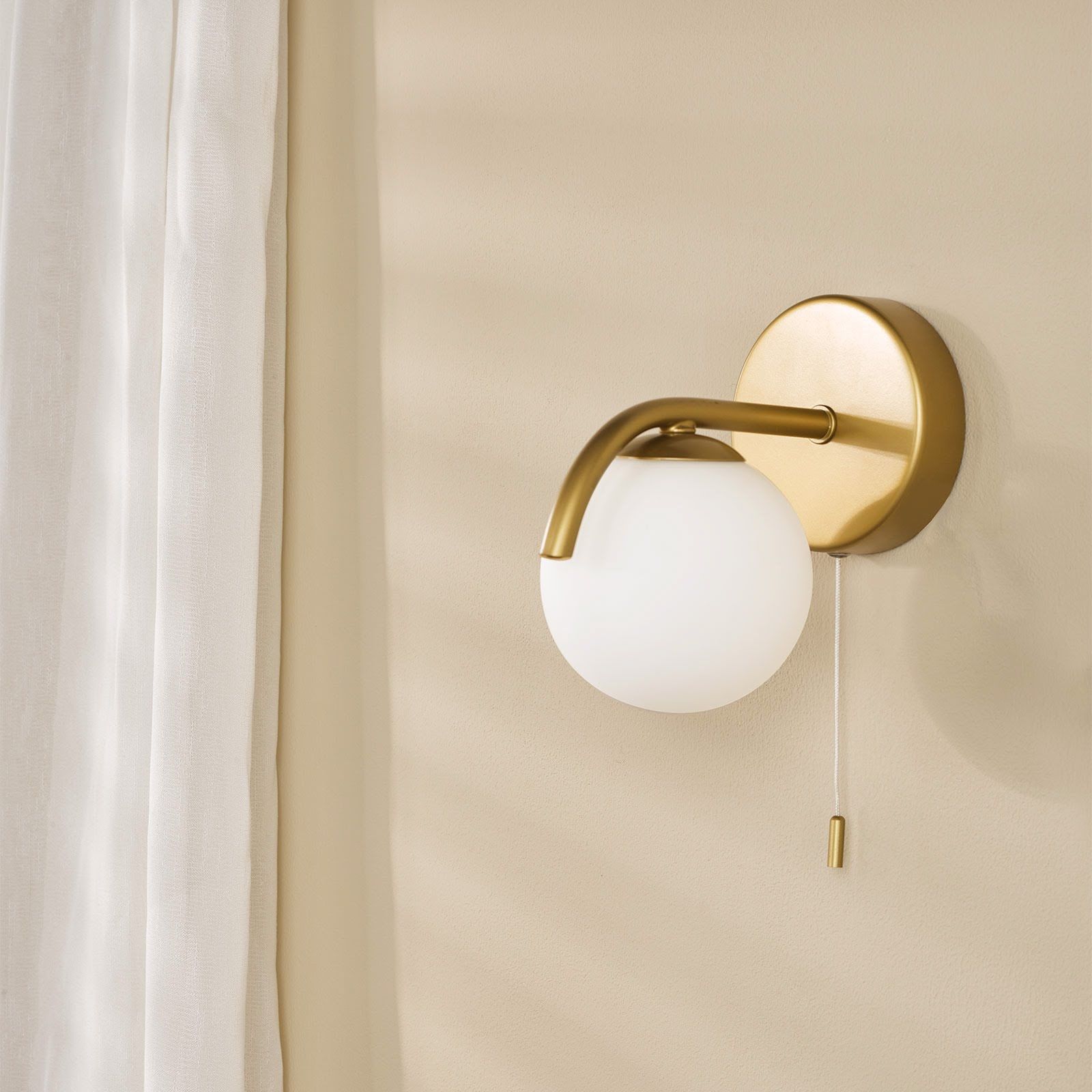 The Orlena Wall Light combines compact design with understated elegance. Its satin gold frame curves gently around a white opal glass globe, creating a soft, diffused glow that enhances any room. Perfect for bedrooms, living rooms, dining areas or hallways, Orlena delivers both functional and ambient light. Blending contemporary simplicity with timeless appeal, it is a versatile piece that adds warmth and refinement to any interior.