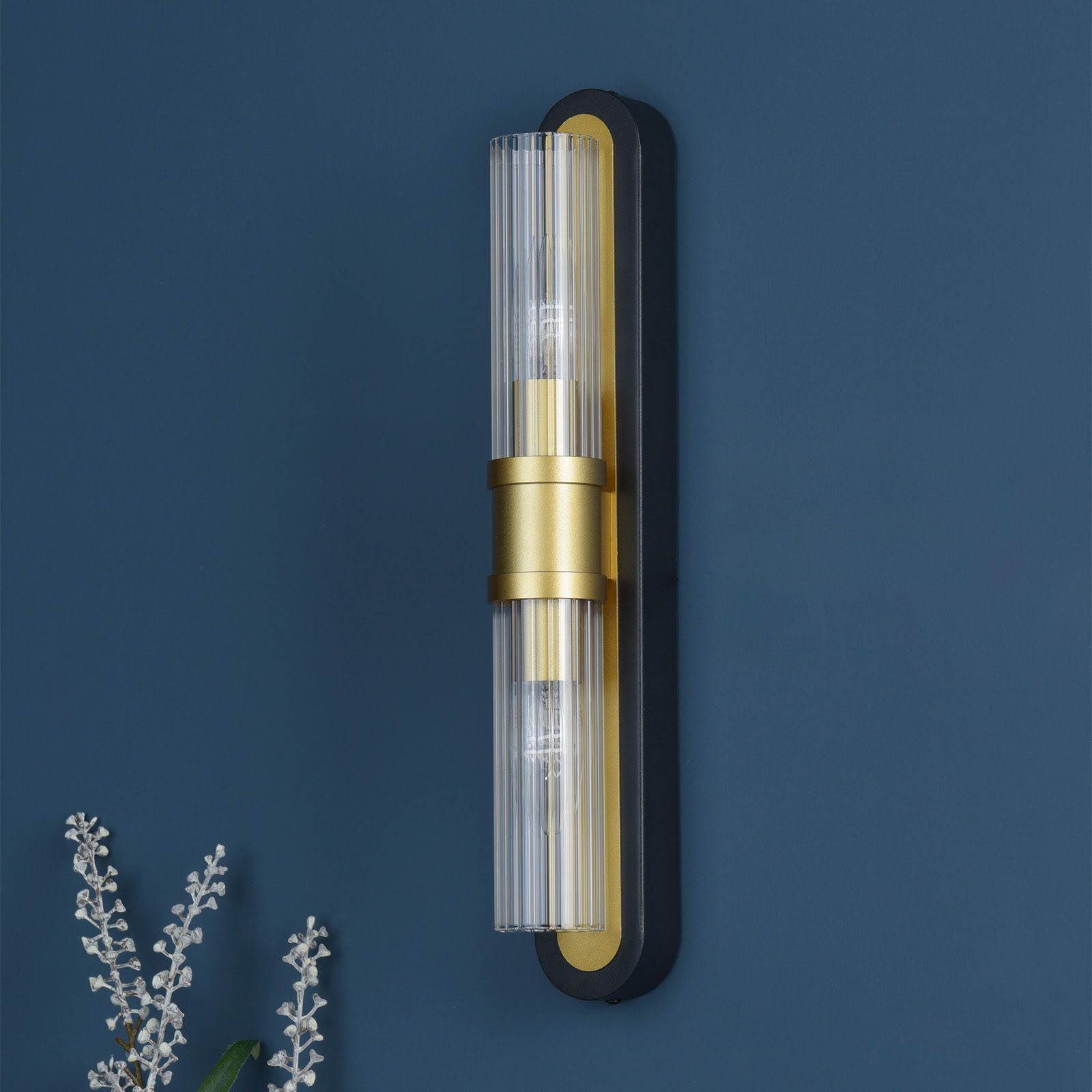 The Rhian 2 light wall fitting pairs a bold matt black frame with ribbed glass shades that create striking patterns of light and shadow. Designed with clean, architectural lines, it brings drama and refinement to any interior. Ideal for hallways, framing mirrors or adding ambience to living rooms and bedrooms, the Rhian delivers bright illumination through its two E14 lamp holders. A sleek modern design with a sophisticated edge, it elevates everyday spaces with confident style.
