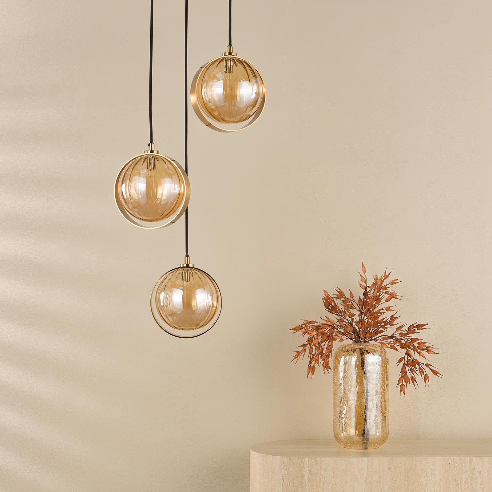 Ophira 3 Light Cluster Pendant Antique Gold and Amber Ribbed Glass