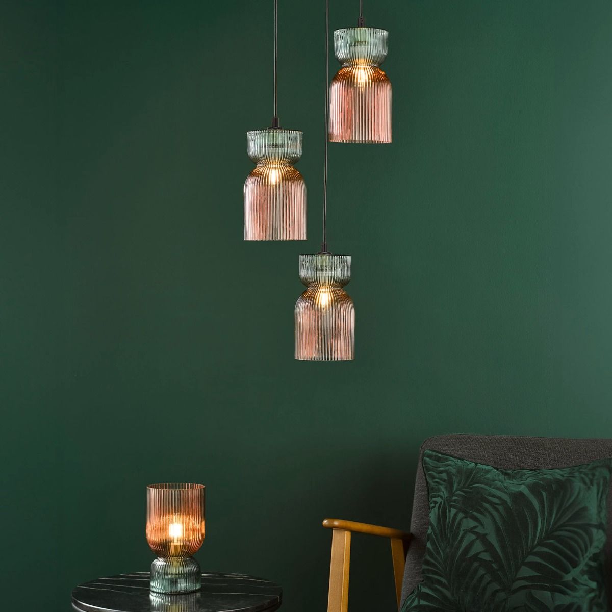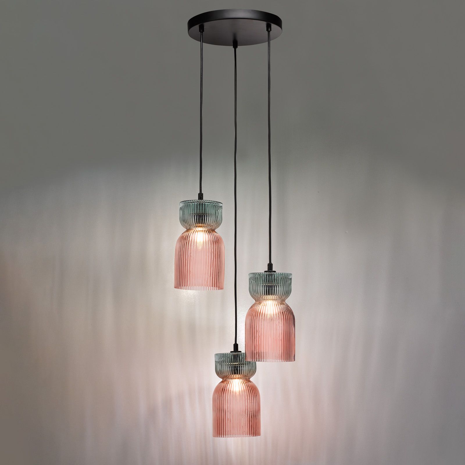 Rhubarb 3 Light Cluster Pendant Pink and Green Ribbed Glass