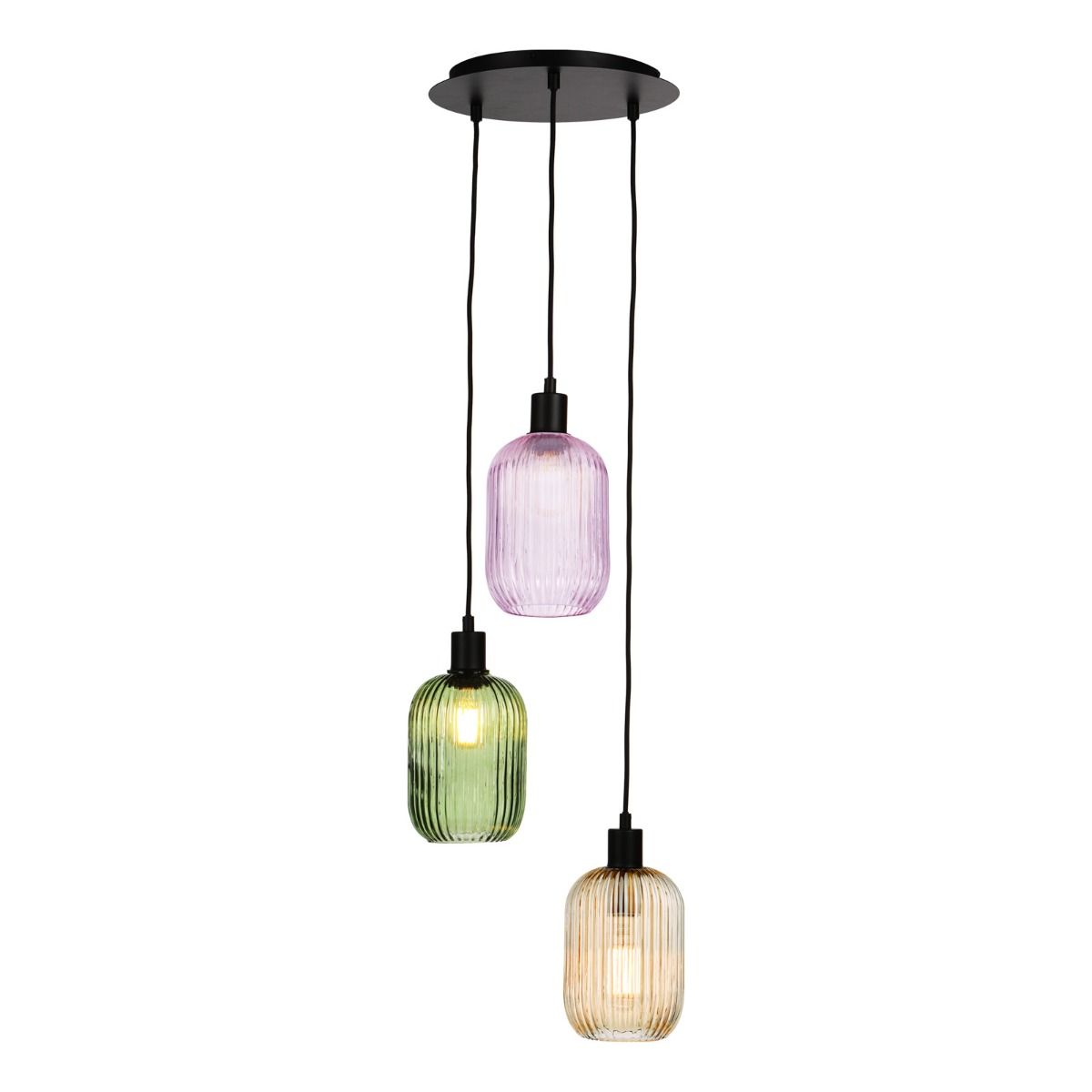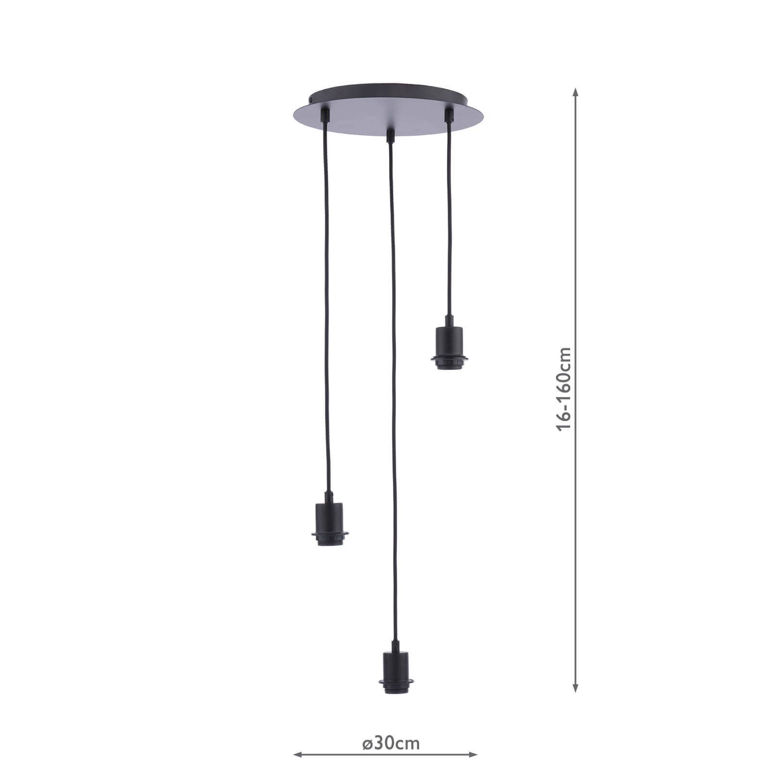 A 3 Light Cluster Suspension in a matt black finish, black braided cables and ES/E27 lampholders. With a maximum shade weight of 2.2 kg per cable, this fitting can be mixed and matched with any E27 shade.
