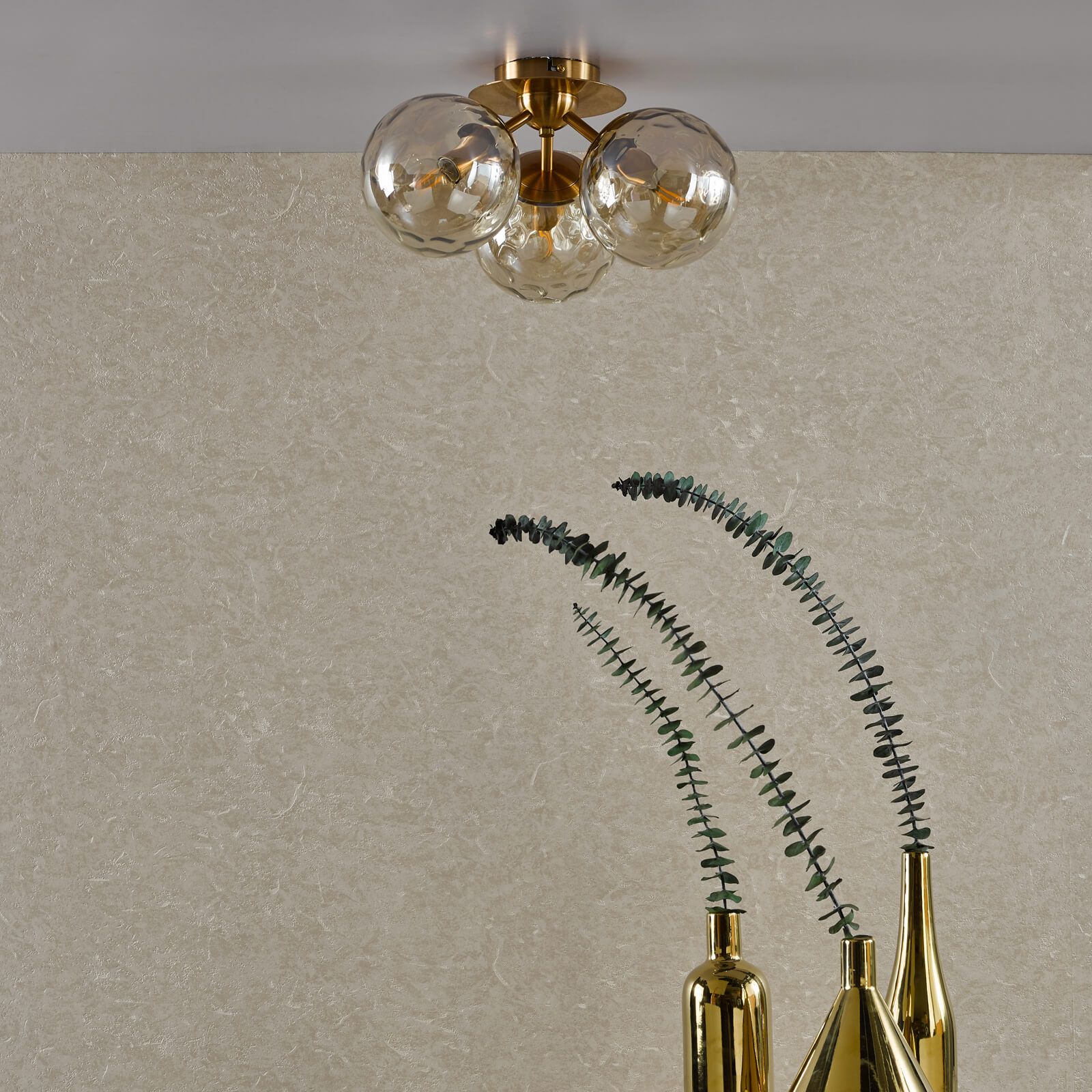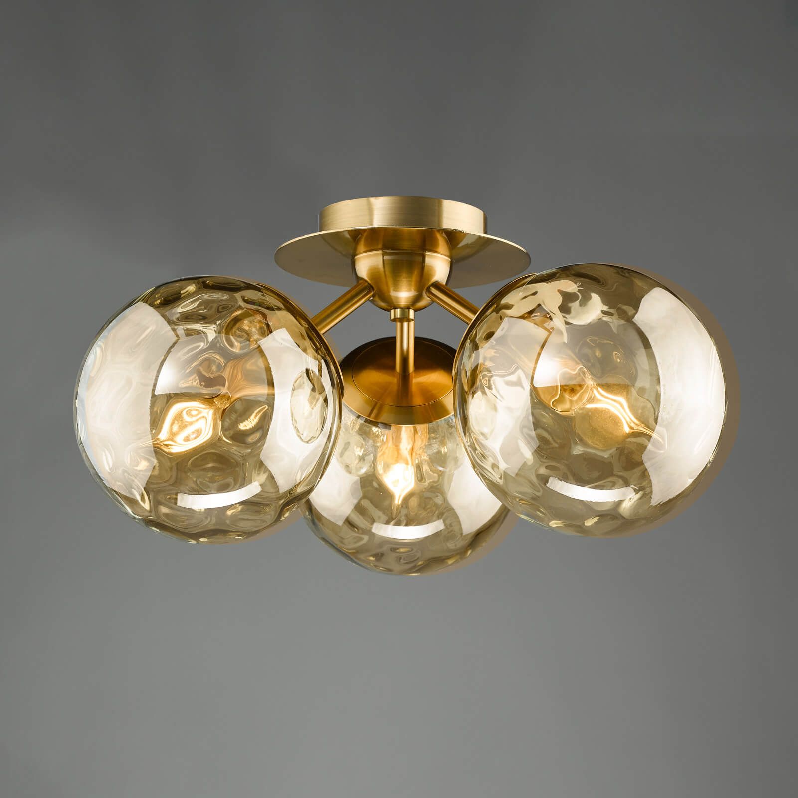 Ulrika 3 Light Flush Antique Brass and Amber Glass