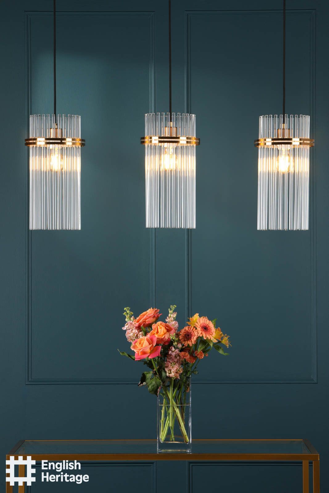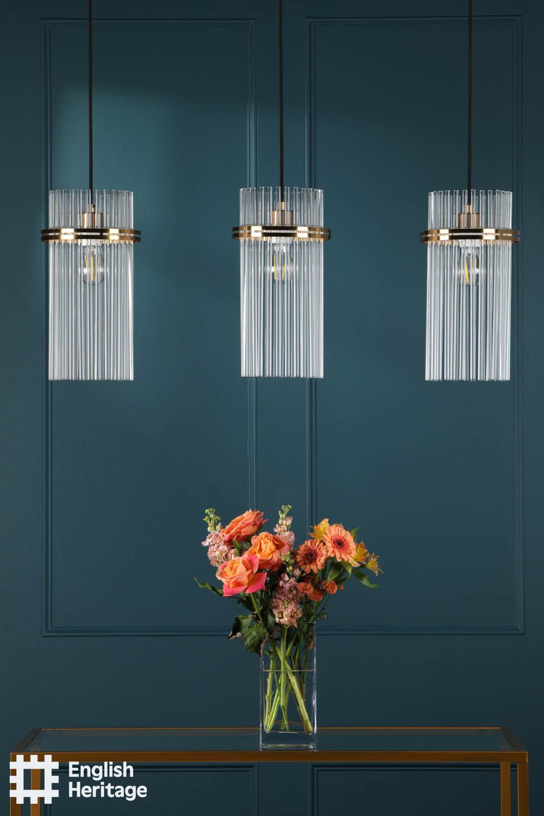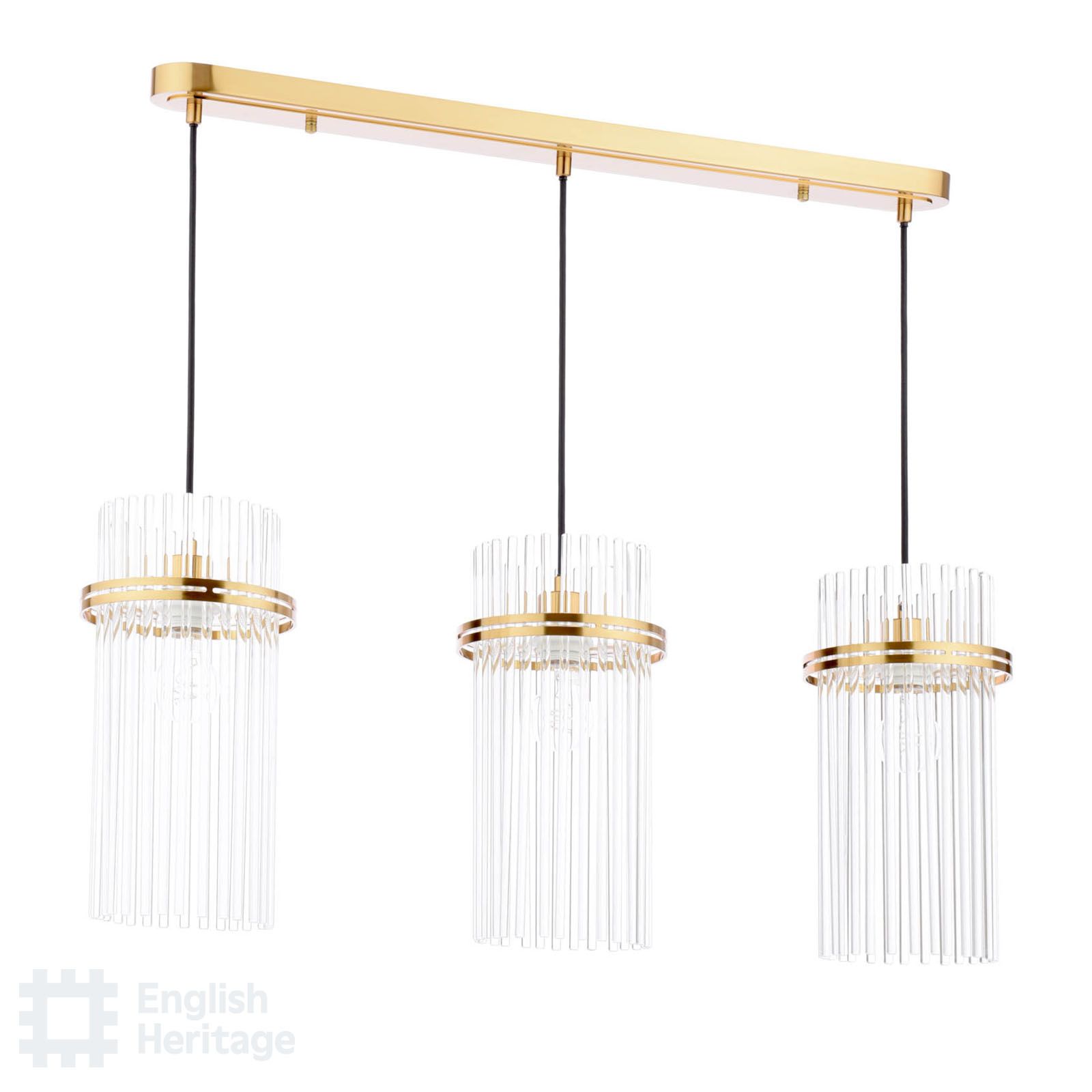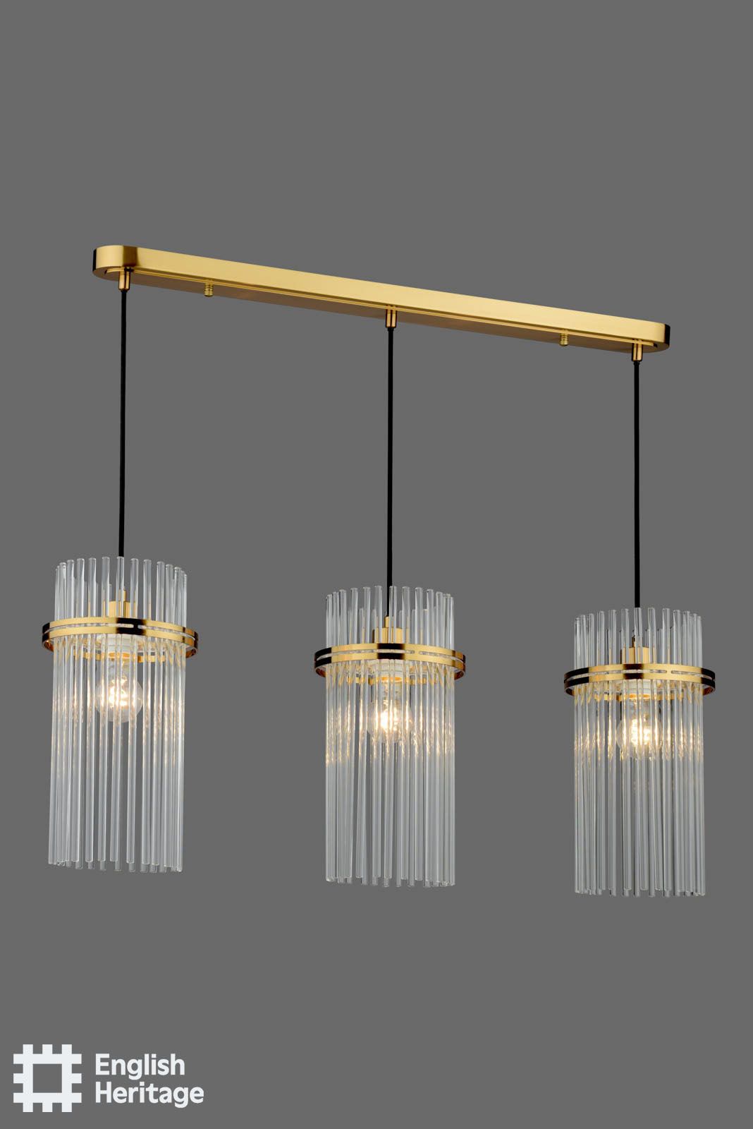 Part of the English Heritage lighting collection, inspired by the striking interiors of Eltham Palace, this three light bar pendant reflects the architectural symmetry and restrained glamour of its Art Deco heritage. Cylindrical glass shades formed from vertical rods softly diffuse the light, creating an elegant and balanced glow with a mesmerising sparkle. Finished in antique gold detailing, the linear design is ideal for positioning over dining tables or kitchen islands. Both decorative and functional, it brings heritage sophistication and contemporary clarity to modern living spaces.