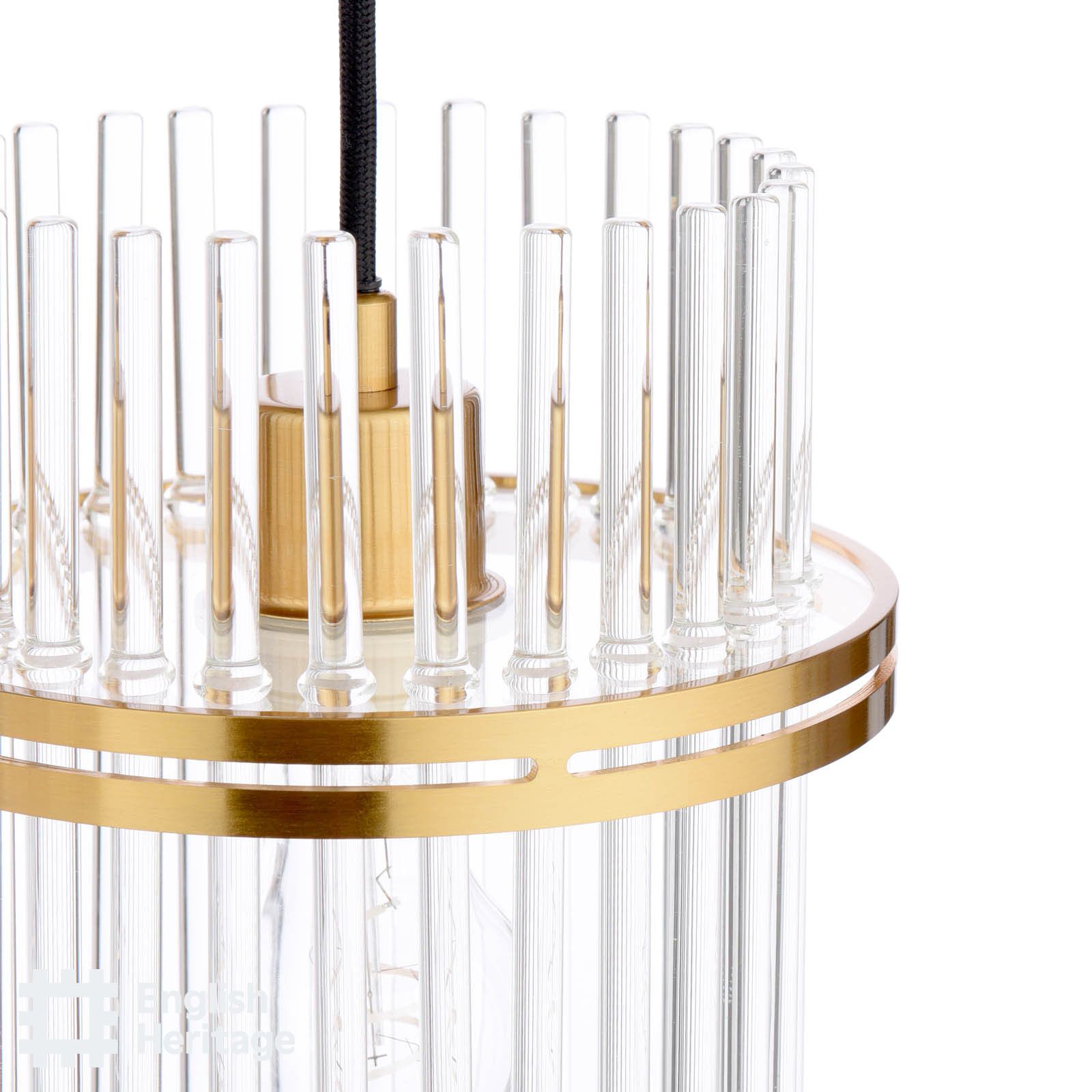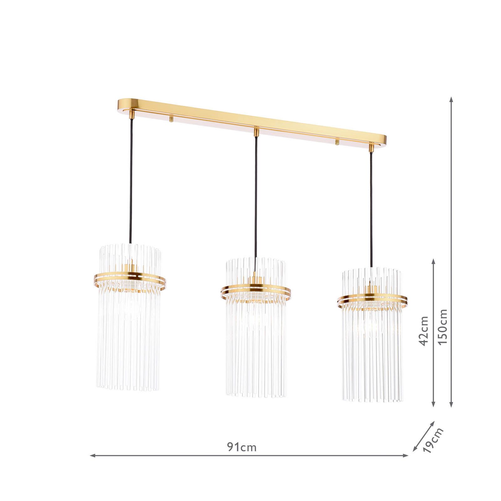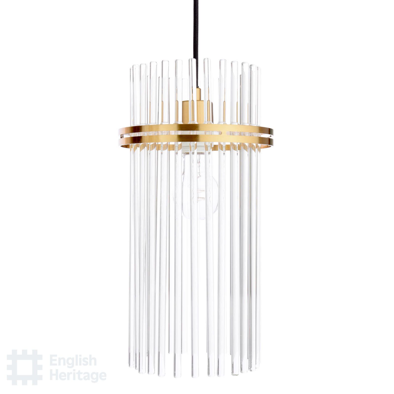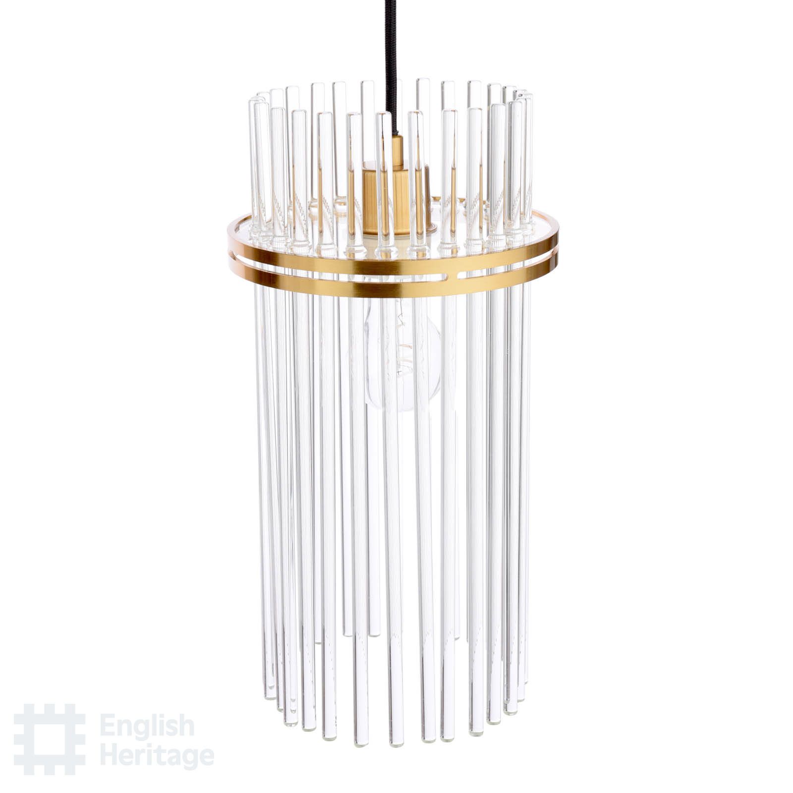 Part of the English Heritage lighting collection, inspired by the striking interiors of Eltham Palace, this three light bar pendant reflects the architectural symmetry and restrained glamour of its Art Deco heritage. Cylindrical glass shades formed from vertical rods softly diffuse the light, creating an elegant and balanced glow with a mesmerising sparkle. Finished in antique gold detailing, the linear design is ideal for positioning over dining tables or kitchen islands. Both decorative and functional, it brings heritage sophistication and contemporary clarity to modern living spaces.