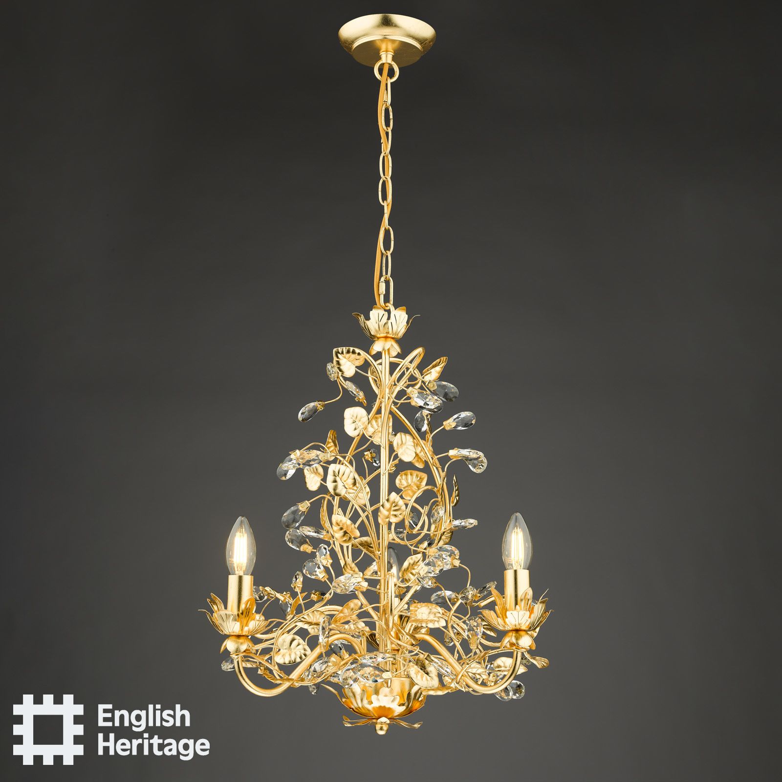 Part of the English Heritage lighting collection, inspired by Great British houses and gardens. The Audley End 3 Light Tole Chandelier, finished in hand-applied gold leaf and decorative cut crystal weaves through the intricate branches of the design. When creating a truly luxurious chandelier, our designer drew inspiration from the delicately carved and gilded state bed in the Howard Suite of Audley End HouseThe Audley End 3 Light Tole chandelier is the perfect centrepiece in a bedroom, lounge, or anywhere you want to add more than a touch of traditional elegance. With a metre of chain and cable, the height can be adjusted on installation to suit most rooms. If ceiling height is an issue, we've also designed a matching semi-flush ceiling light.