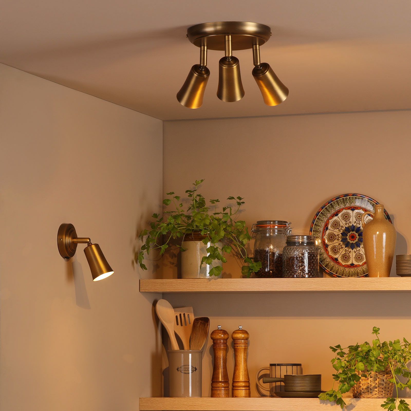 The Jedrek 3 light flush ceiling plate combines heritage styling with practical versatility in a compact design. Crafted from steel with a rich aged brass finish, it features a stepped backplate detail that adds subtle character. Three fully adjustable heads provide precise directional lighting, making it perfect for highlighting artwork, illuminating dark corners, or delivering focused task light. Ideal for kitchens, studies, bedrooms, corridors, or cottage-core and farmhouse-inspired interiors, the Jedrek offers an authentic traditional feel in a space-saving form. Blending classic style with modern function, it delivers a timeless and practical lighting solution for everyday use.