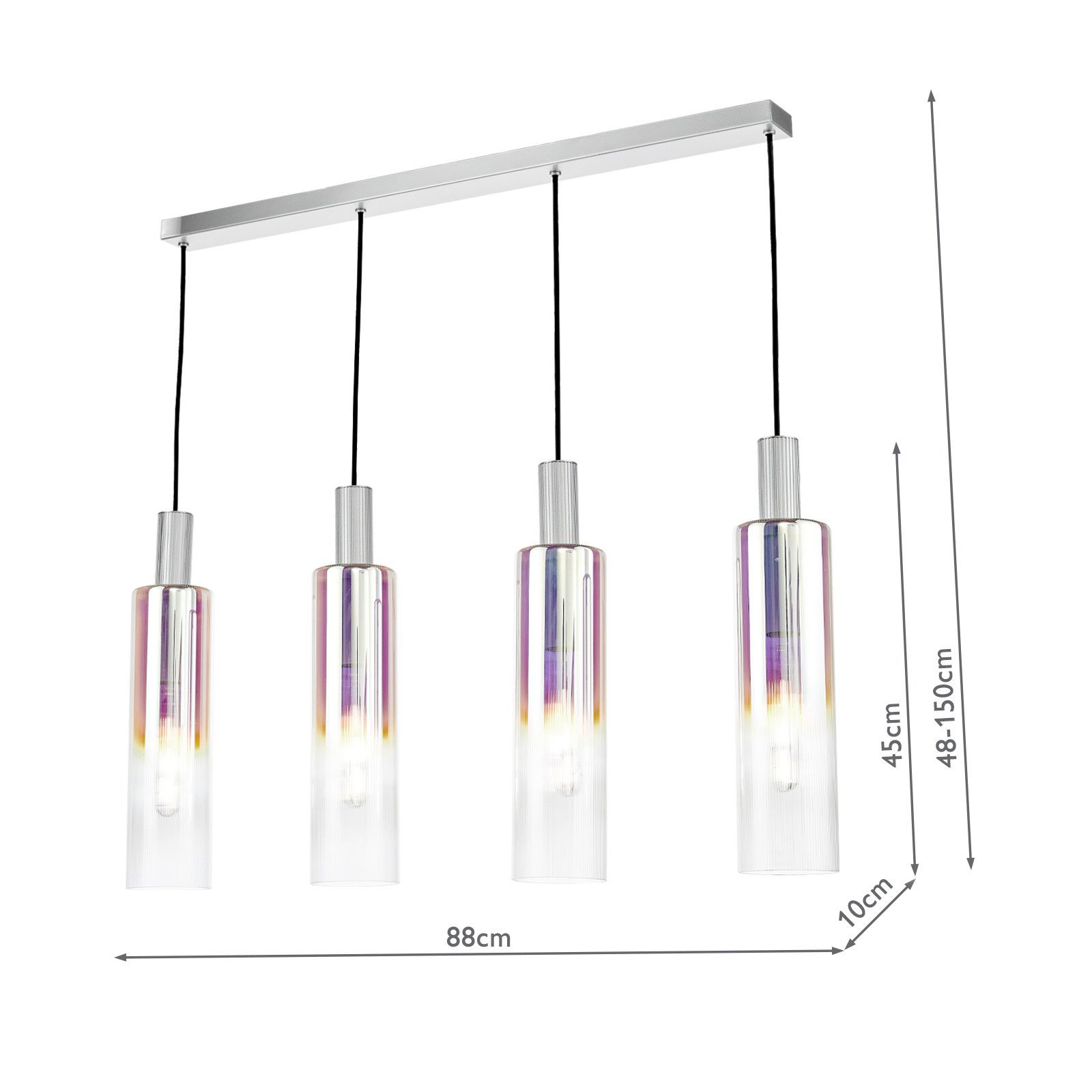 The Ruben 4 Light Bar Pendant, a sleek and stylish lighting fixture designed to make a statement in your space. This pendant features a satin silver finish and ribbed iridised glass shades, which can be positioned at any height along the frame, adding a touch of modern functionality to any room. The Ruben 4 Light Bar Pendant is perfect for illuminating larger areas such as dining rooms or kitchen islands, providing ample light while adding a touch of modern elegance to your home.