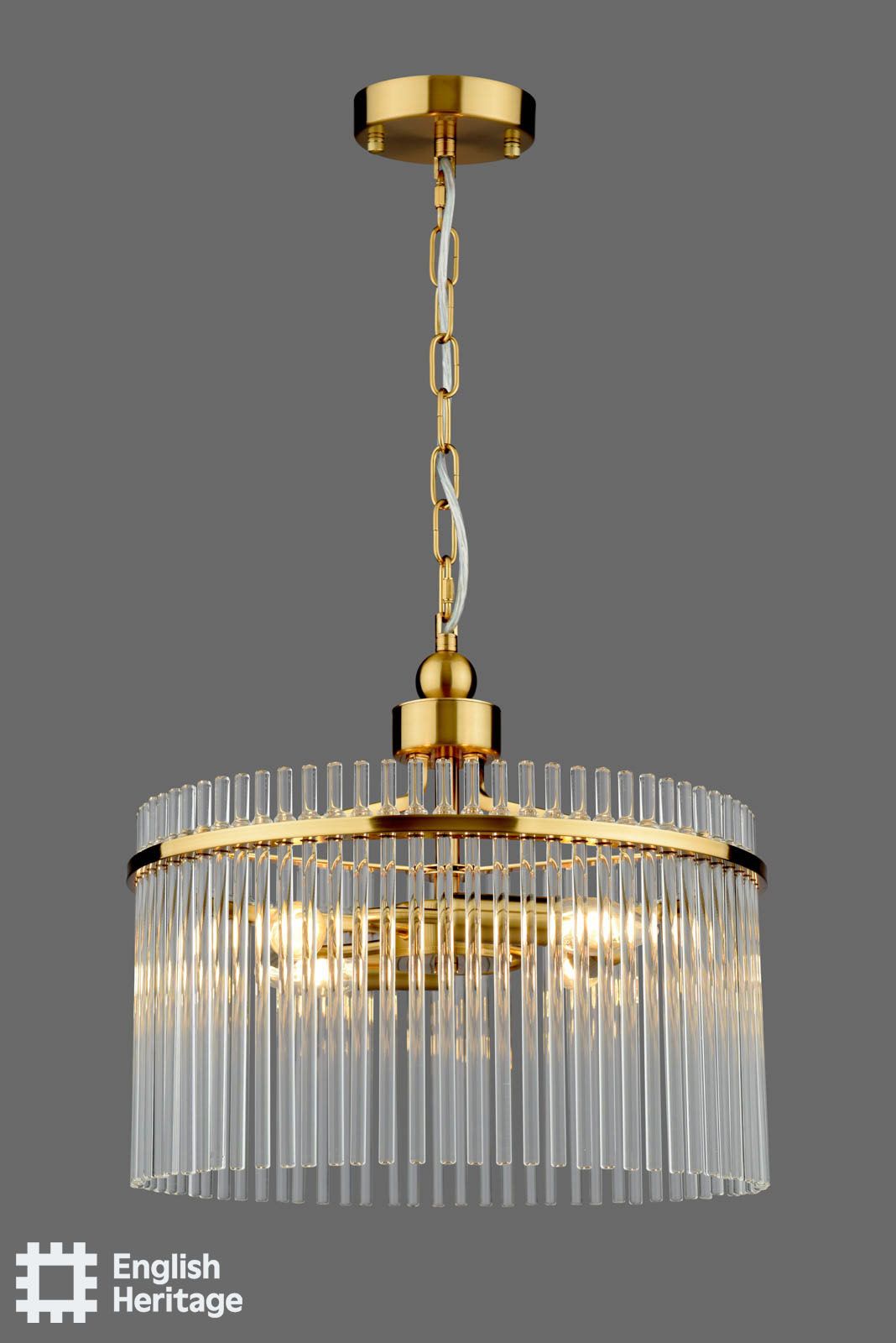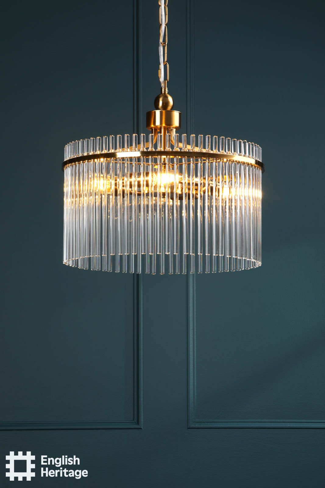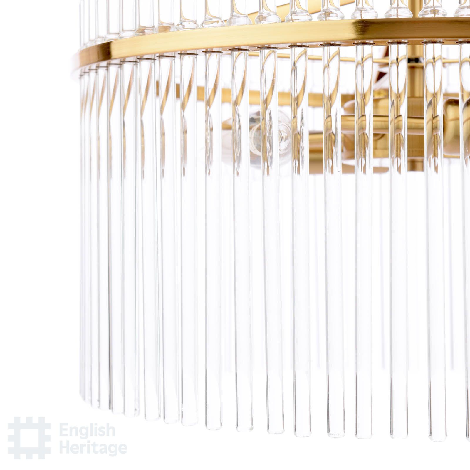 Part of the English Heritage lighting collection, inspired by the refined interiors of Eltham Palace, this chandelier reflects the restrained glamour and architectural confidence of its Art Deco heritage. Finished in antique gold, the circular frame is adorned with clear glass rods that surround the light, catching and refracting it to create a warm, atmospheric glow. Elegant and balanced in form, it makes a striking centrepiece for dining rooms, living spaces or stairwells, bringing a sense of heritage sophistication and timeless luxury to the home.