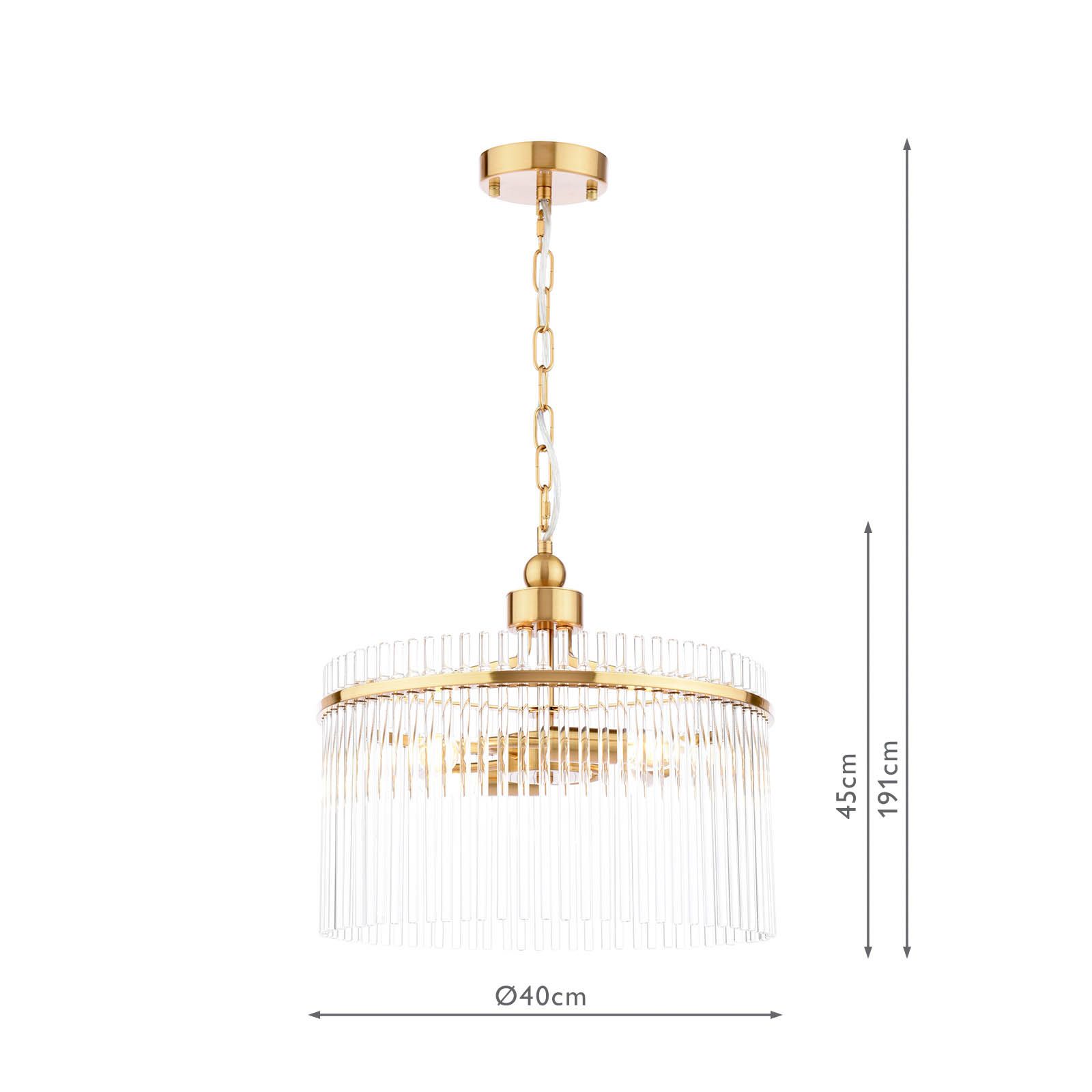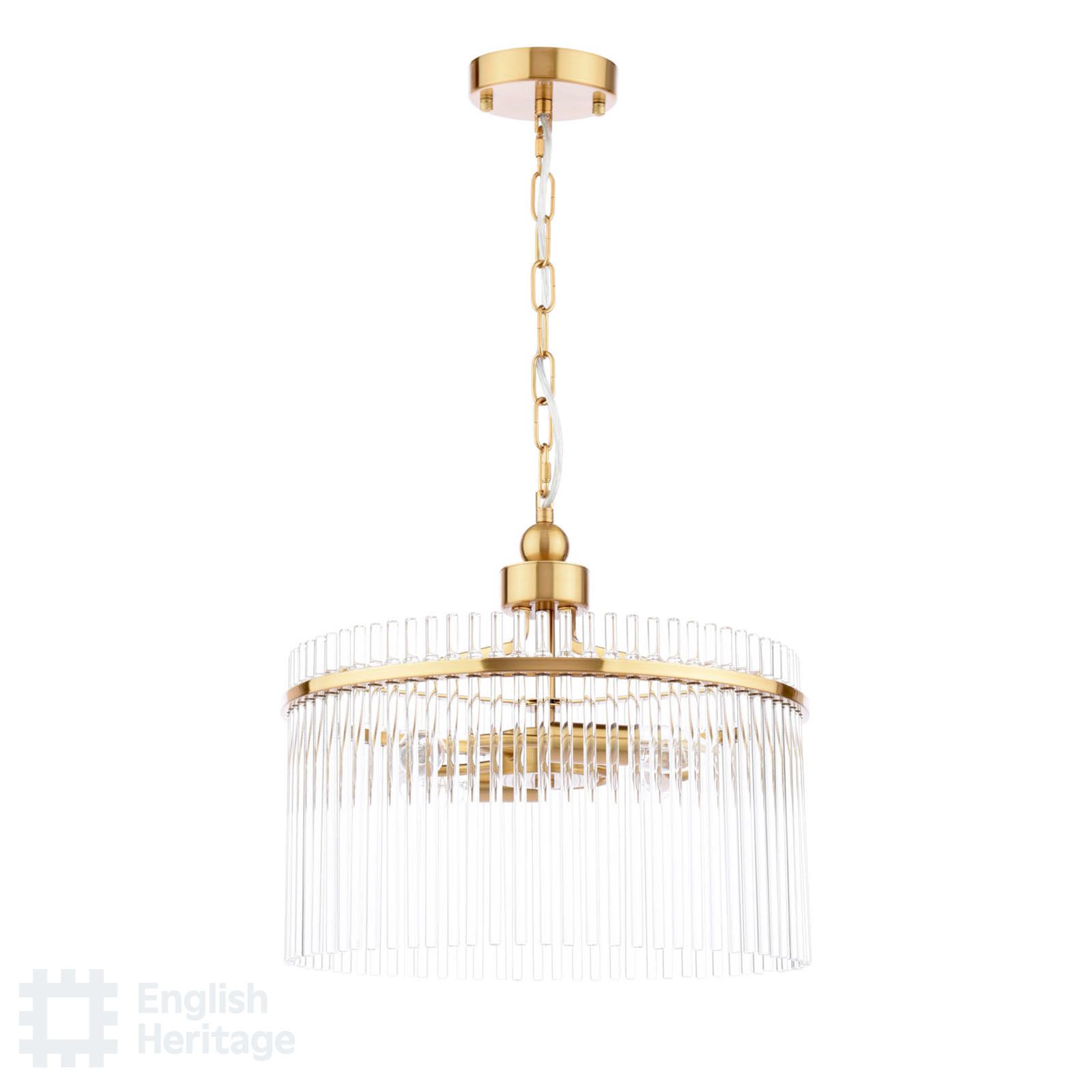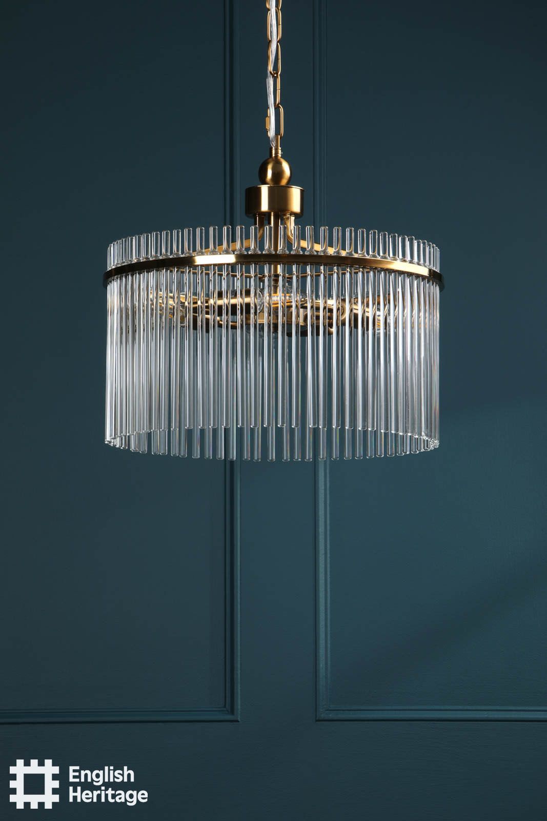 Part of the English Heritage lighting collection, inspired by the refined interiors of Eltham Palace, this chandelier reflects the restrained glamour and architectural confidence of its Art Deco heritage. Finished in antique gold, the circular frame is adorned with clear glass rods that surround the light, catching and refracting it to create a warm, atmospheric glow. Elegant and balanced in form, it makes a striking centrepiece for dining rooms, living spaces or stairwells, bringing a sense of heritage sophistication and timeless luxury to the home.