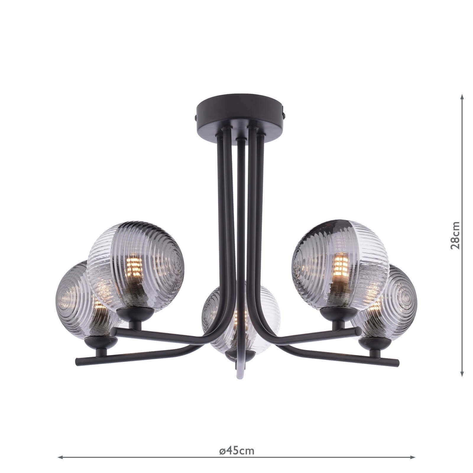Cradle 5 Light Semi Flush Matt Black With Smoked/Clear Ribbed Glass