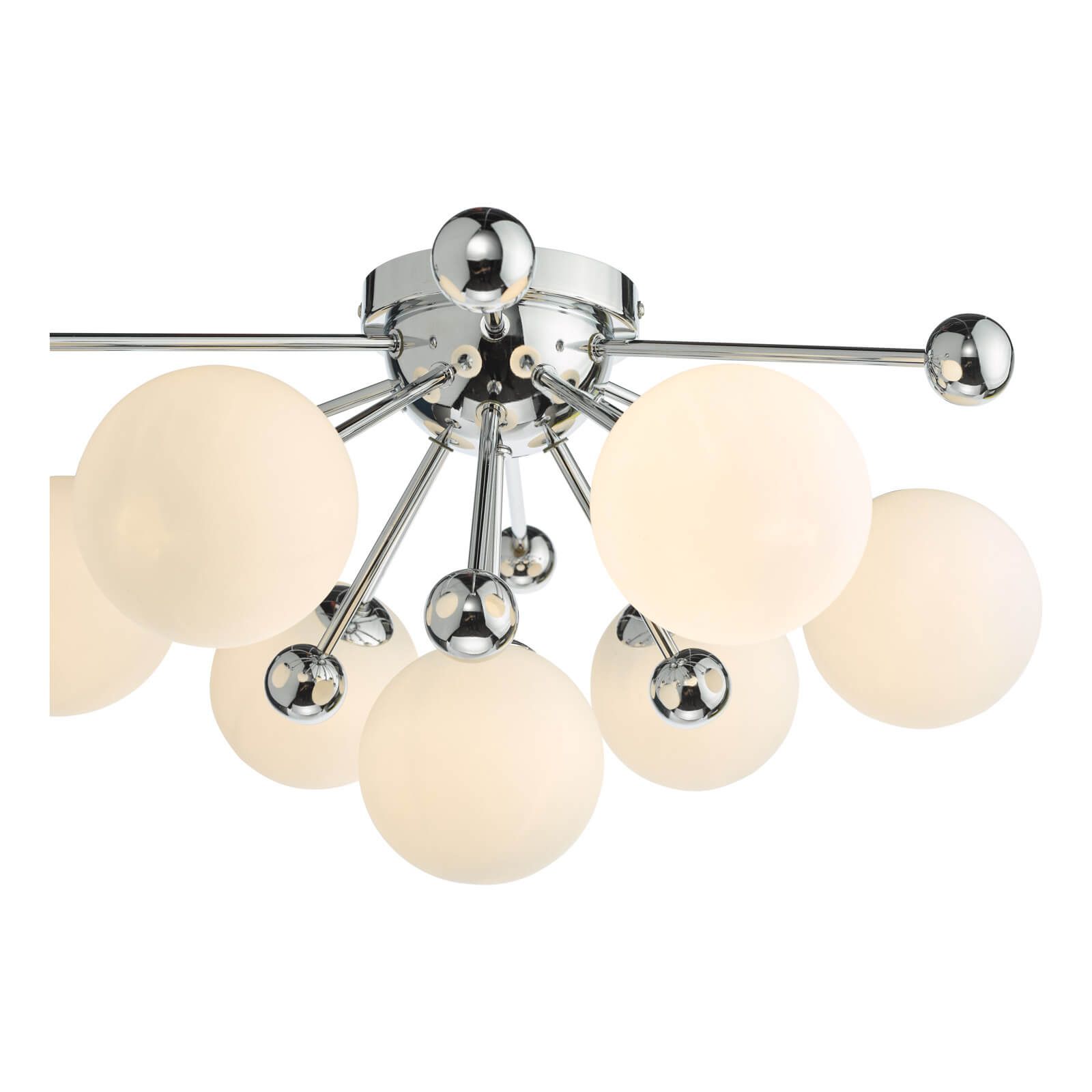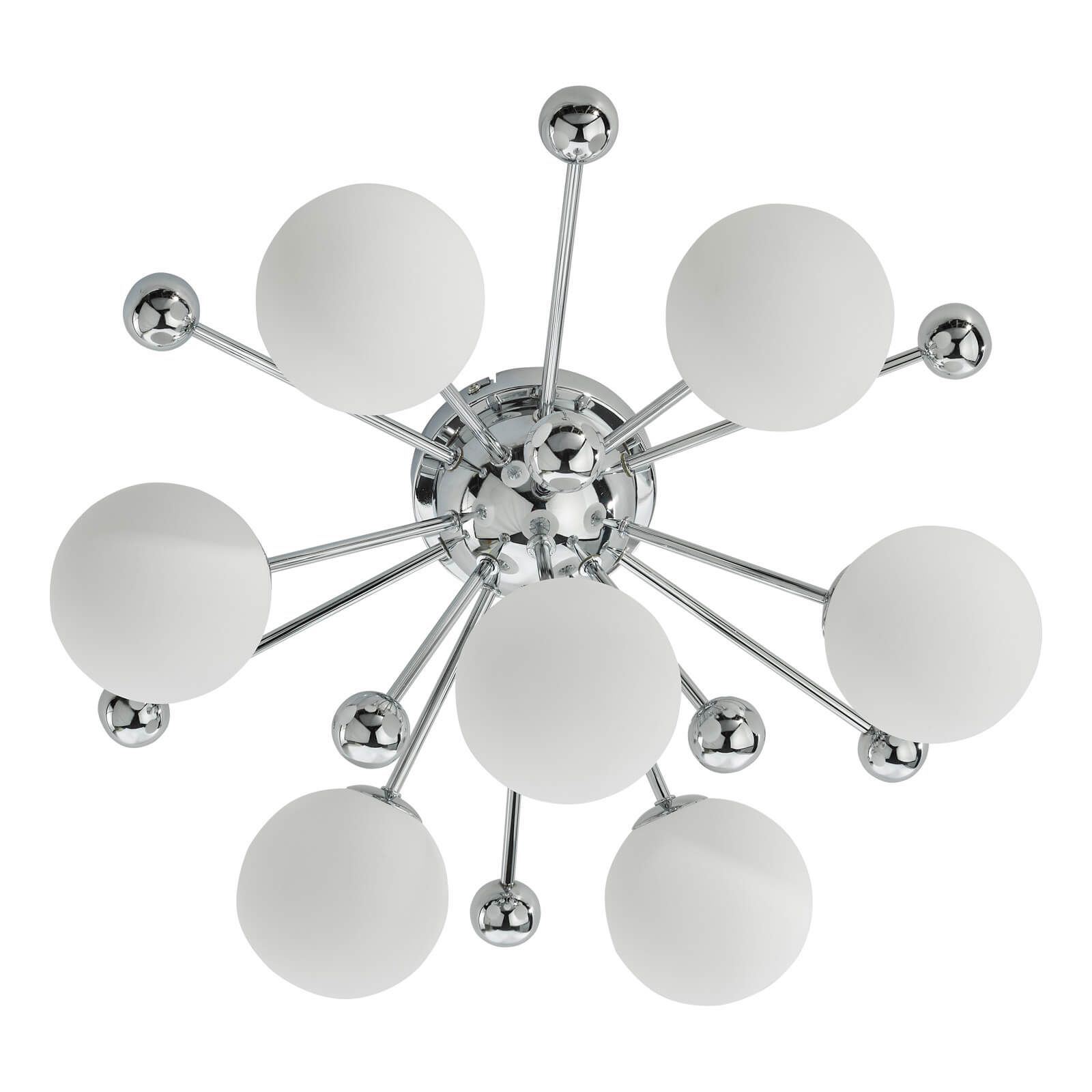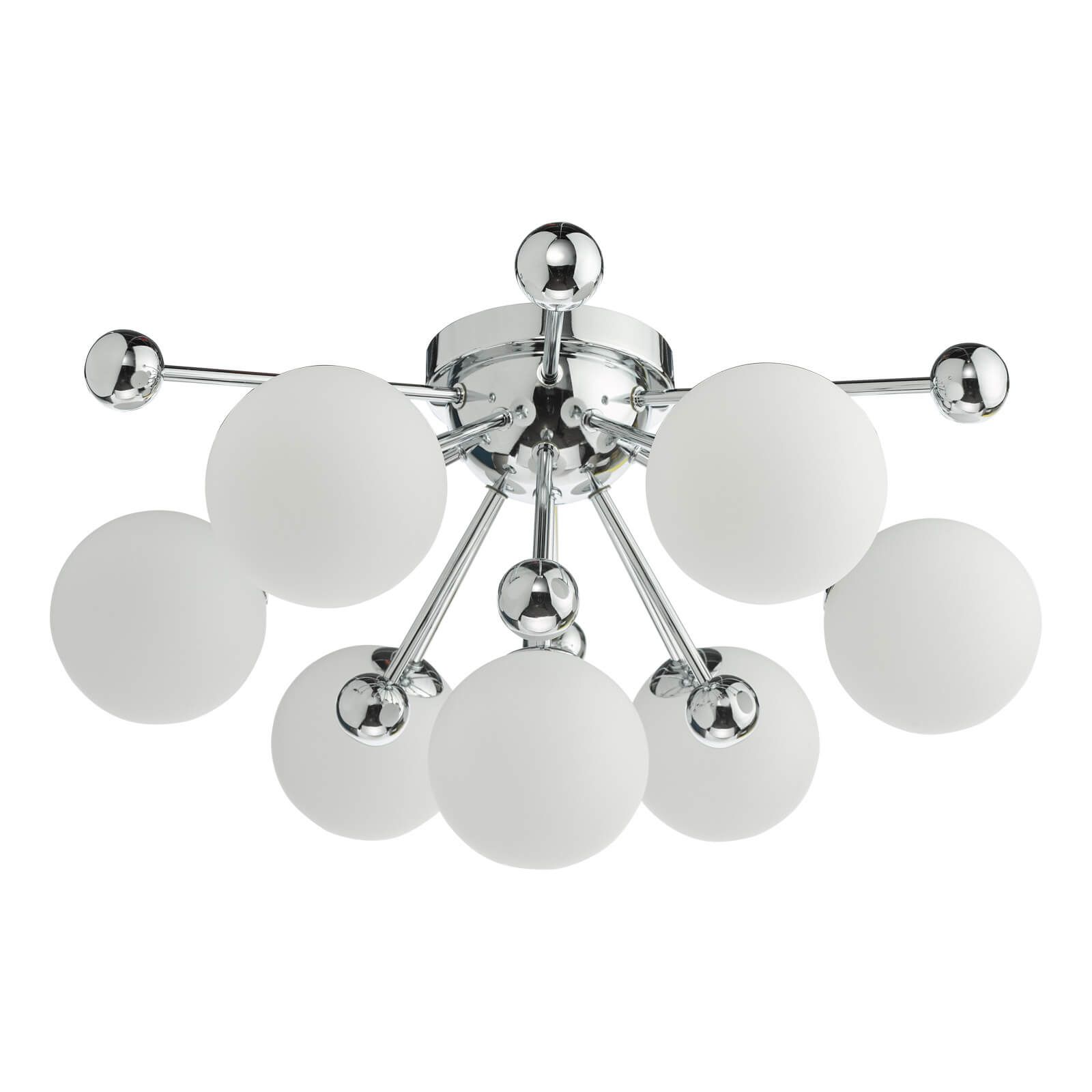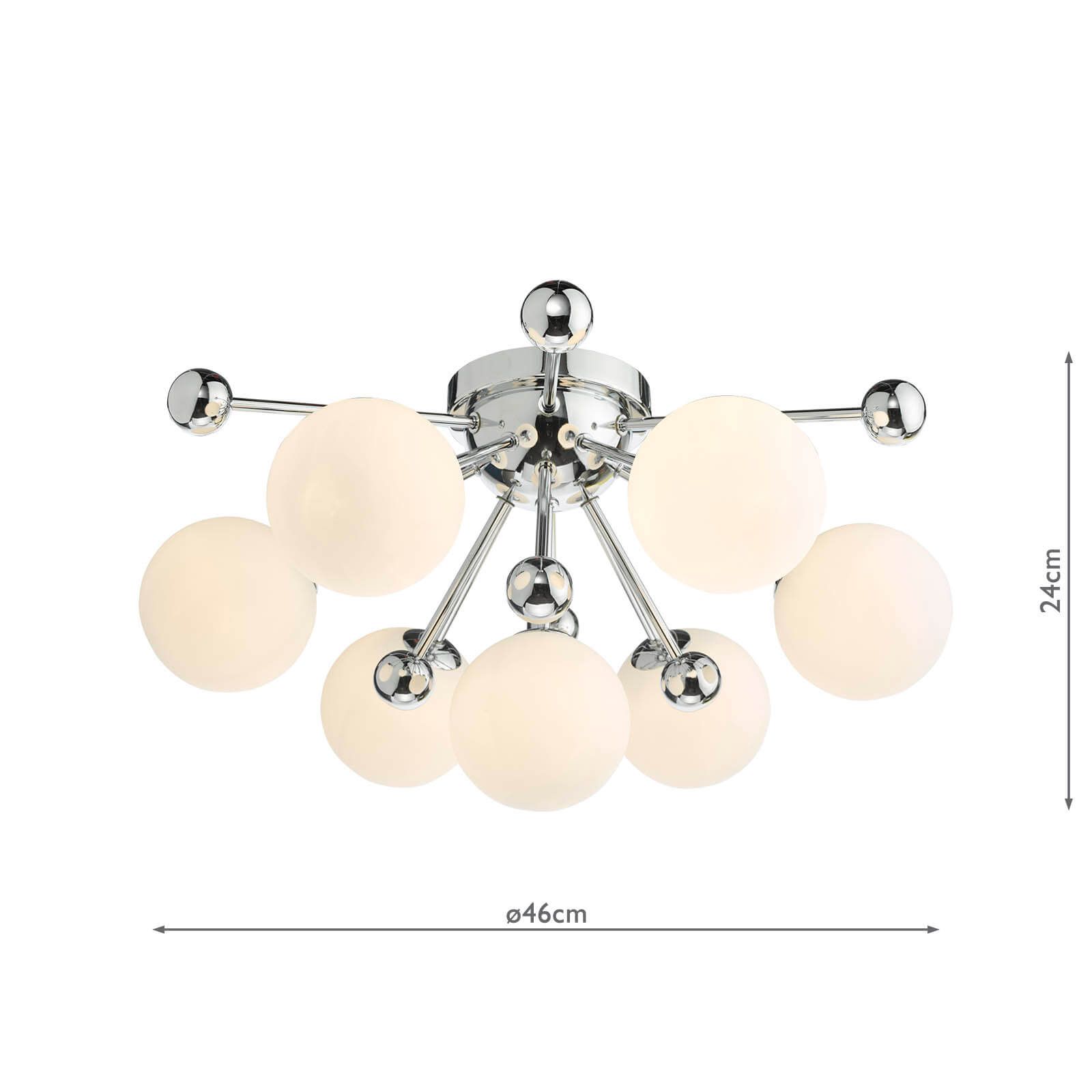 With the capacity to accommodate 7 G9 bulbs (bulbs not included), the Ursa ceiling light emits ample luminosity, casting a welcoming glow throughout your space. To complement its contemporary aesthetic and ensure optimal energy efficiency, we recommend utilizing LED bulbs from our range of LED bulbs. Elevate your home with the Ursa 7 Light Flush Polished Chrome and Opal Glass – a harmonious blend of mid-century motifs and contemporary sophistication that radiates modern charm and elegance.