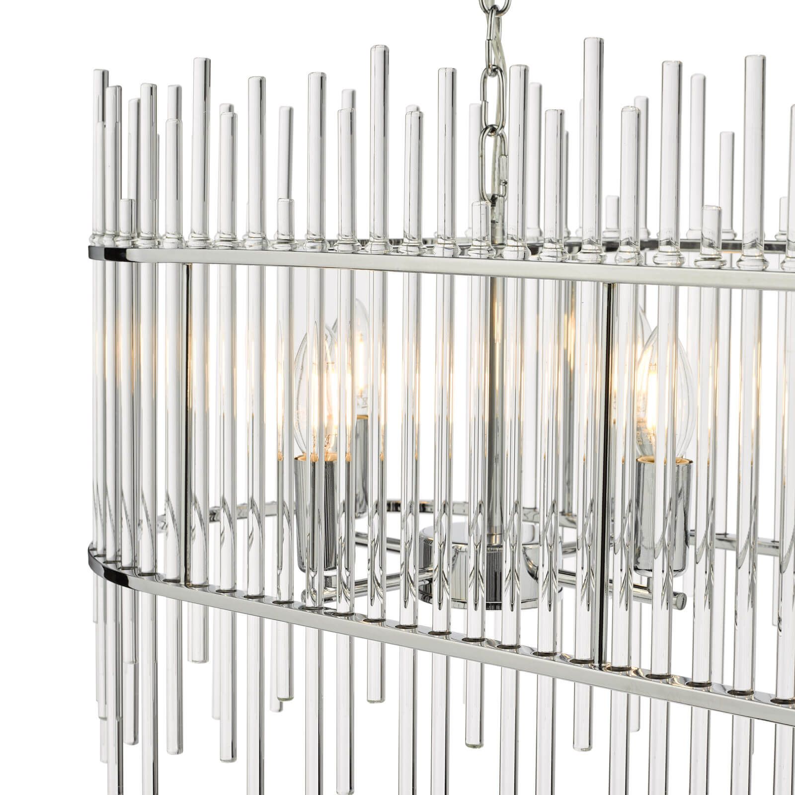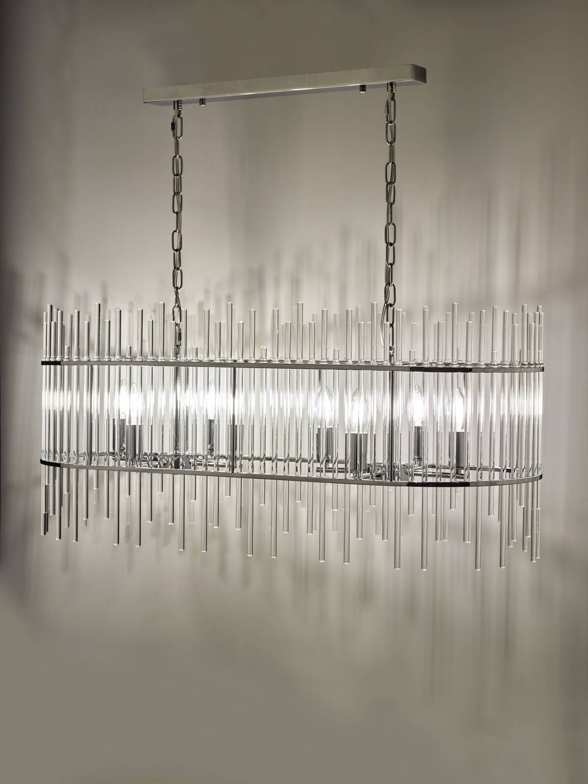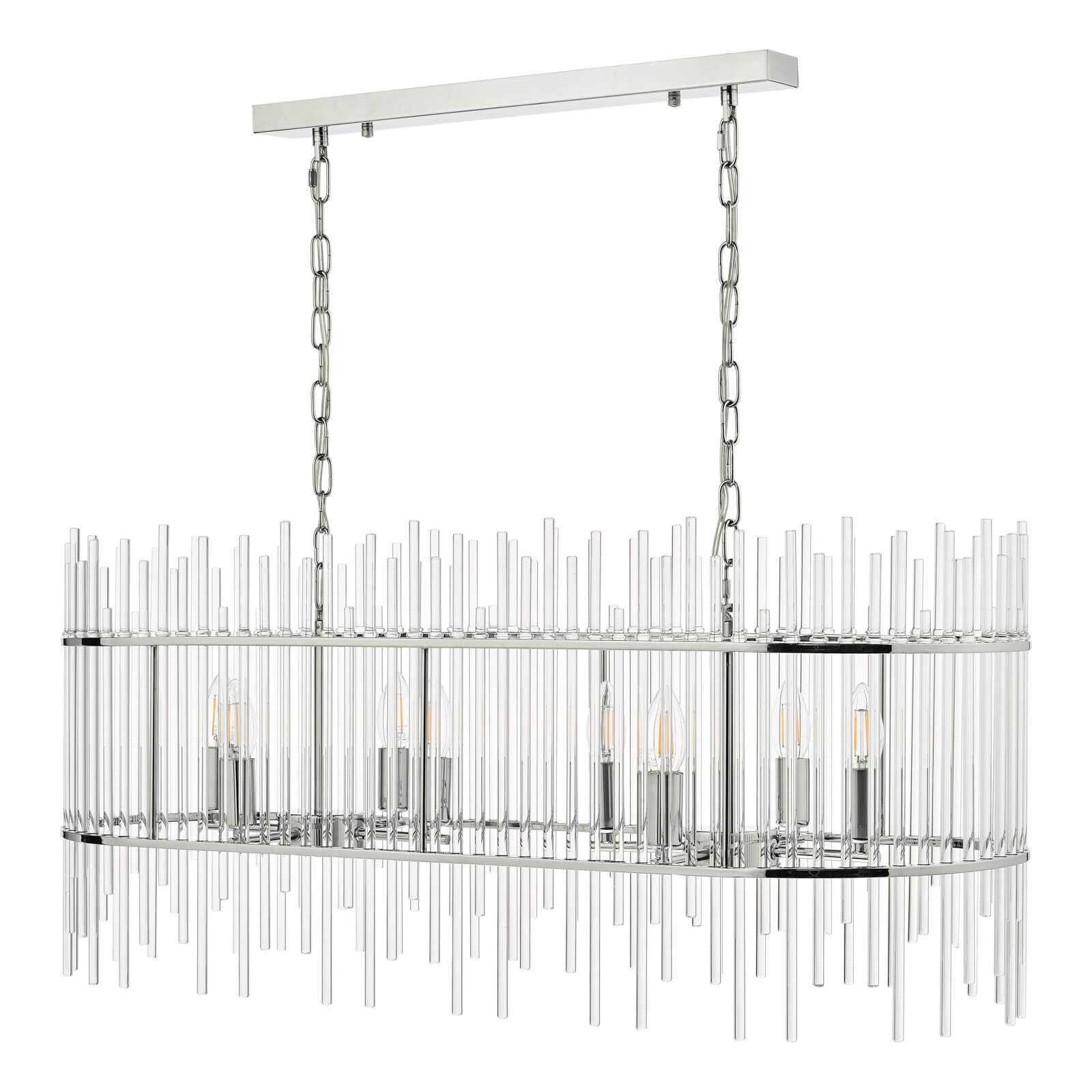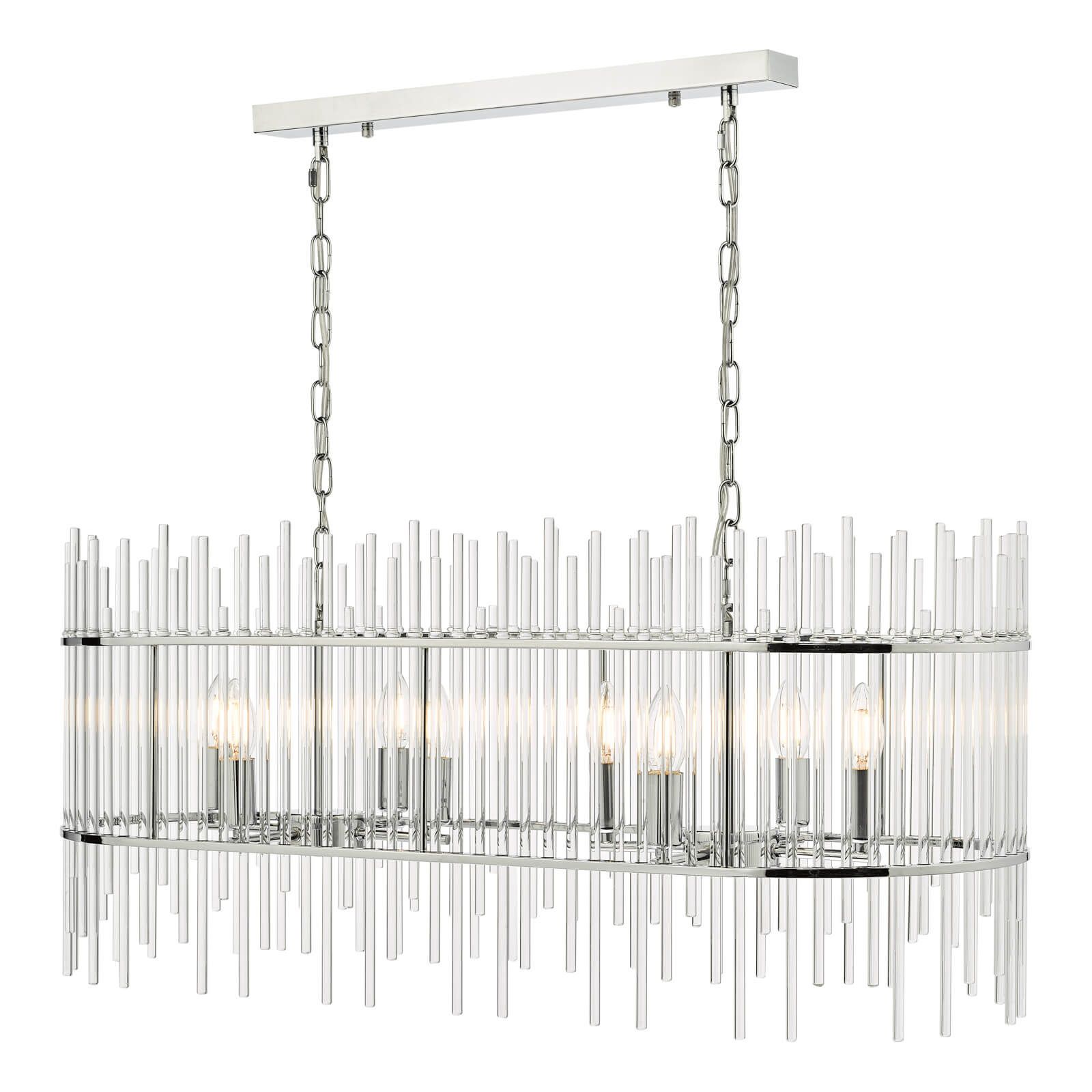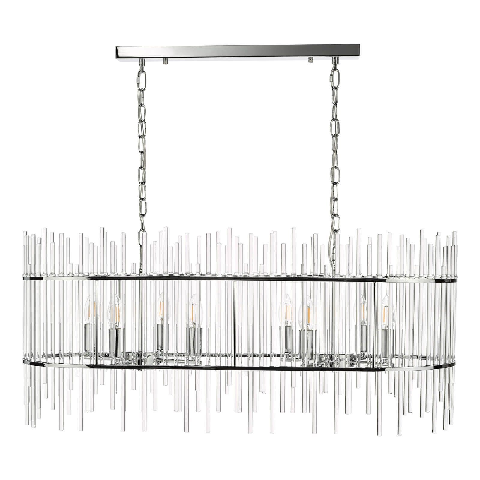 The Finola 8 light bar pendant has a contemporary feel with castellated glass rods and chrome metal work. This modern oval-shaped bar pendant looks fantastic over kitchen islands or dining tables. Fitted with 150cm of chain and clear cable, which is height adjustable on installation. For similar chandeliers and wall lights featuring glass rods, why not try our Lukas range?