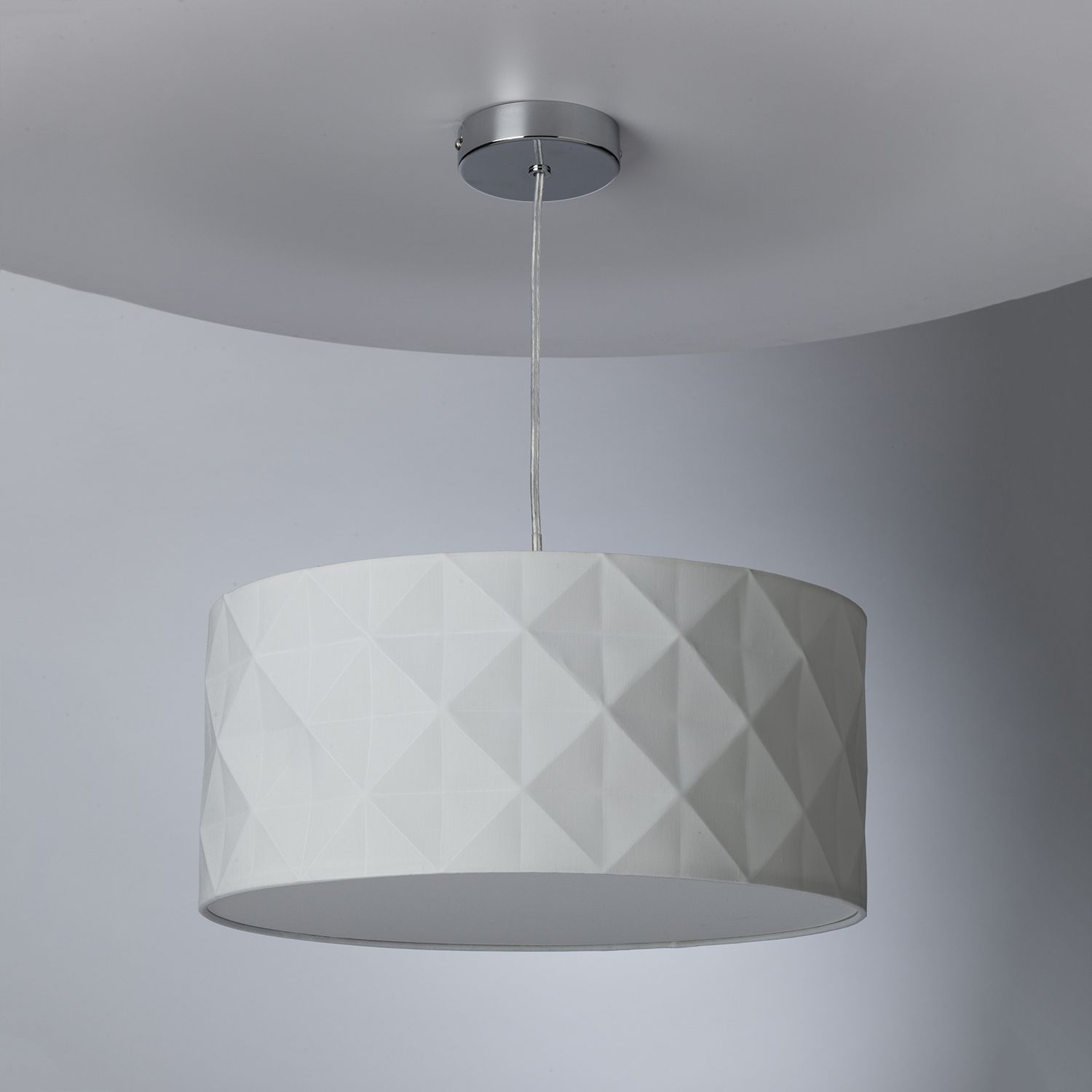 The Aisha is a contemporary geometric pendant featuring a faceted design crafted from smooth white cotton. This shallow drum shade is lined on both sides and comes with a removable white cotton diffuser, allowing it to be suspended at various heights without causing glare.