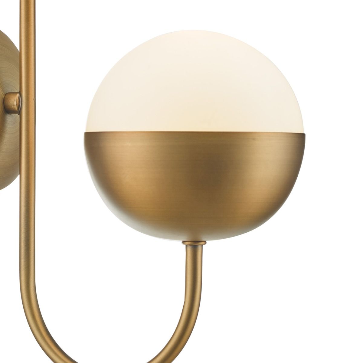 The Andre contemporary wall light features an aged brass framework and opal white glass to form a globe, producing a soft and warm light output.