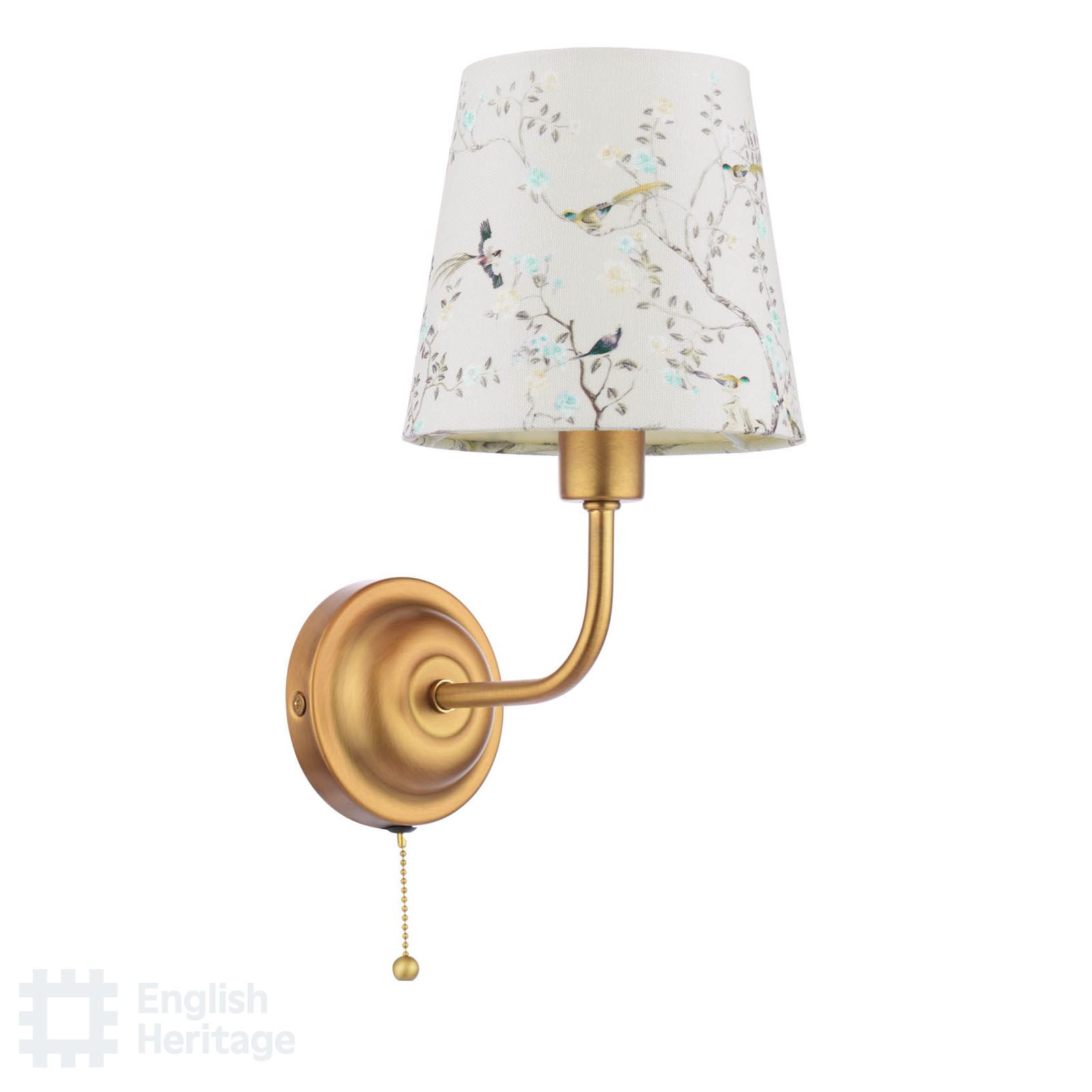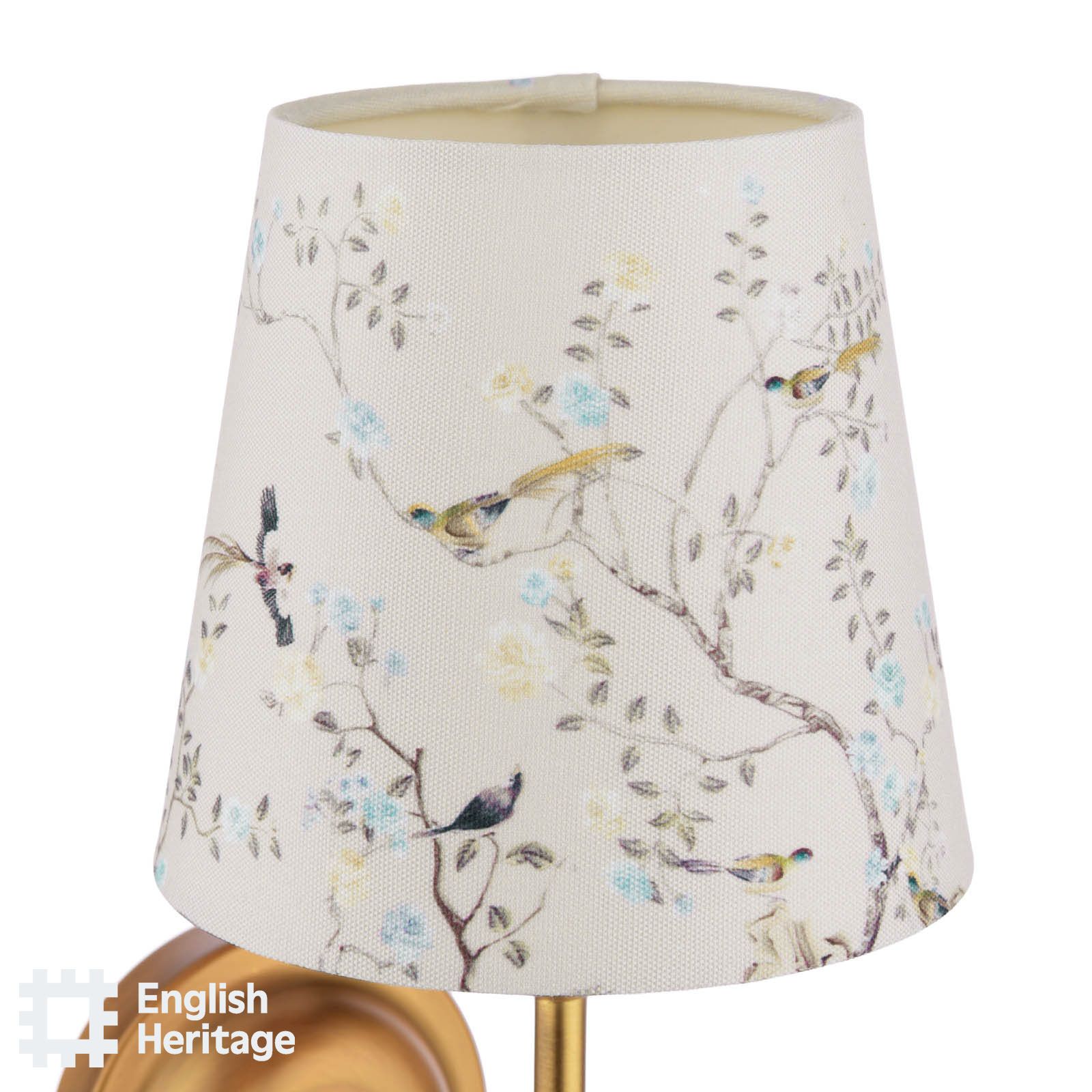 Part of the English Heritage lighting collection, inspired by the historic interiors of Belsay Hall, this elegant wall light reflects the property’s restrained beauty and architectural simplicity. Finished in warm antique brass, the gently curved arm and classic backplate create a timeless, understated silhouette. Paired with a decorative shade inspired by the interiors and gardens of Marble Hill House, the design is softly enriched with natural detail. Featuring a delicate bird and branch motif, the gently tapered shade brings a sense of calm and country house tradition, diffusing the light to create a warm, inviting glow. Together, the fitting and shade form a harmonious heritage piece, adding quiet refinement and character to hallways, bedrooms, dining rooms or living areas.