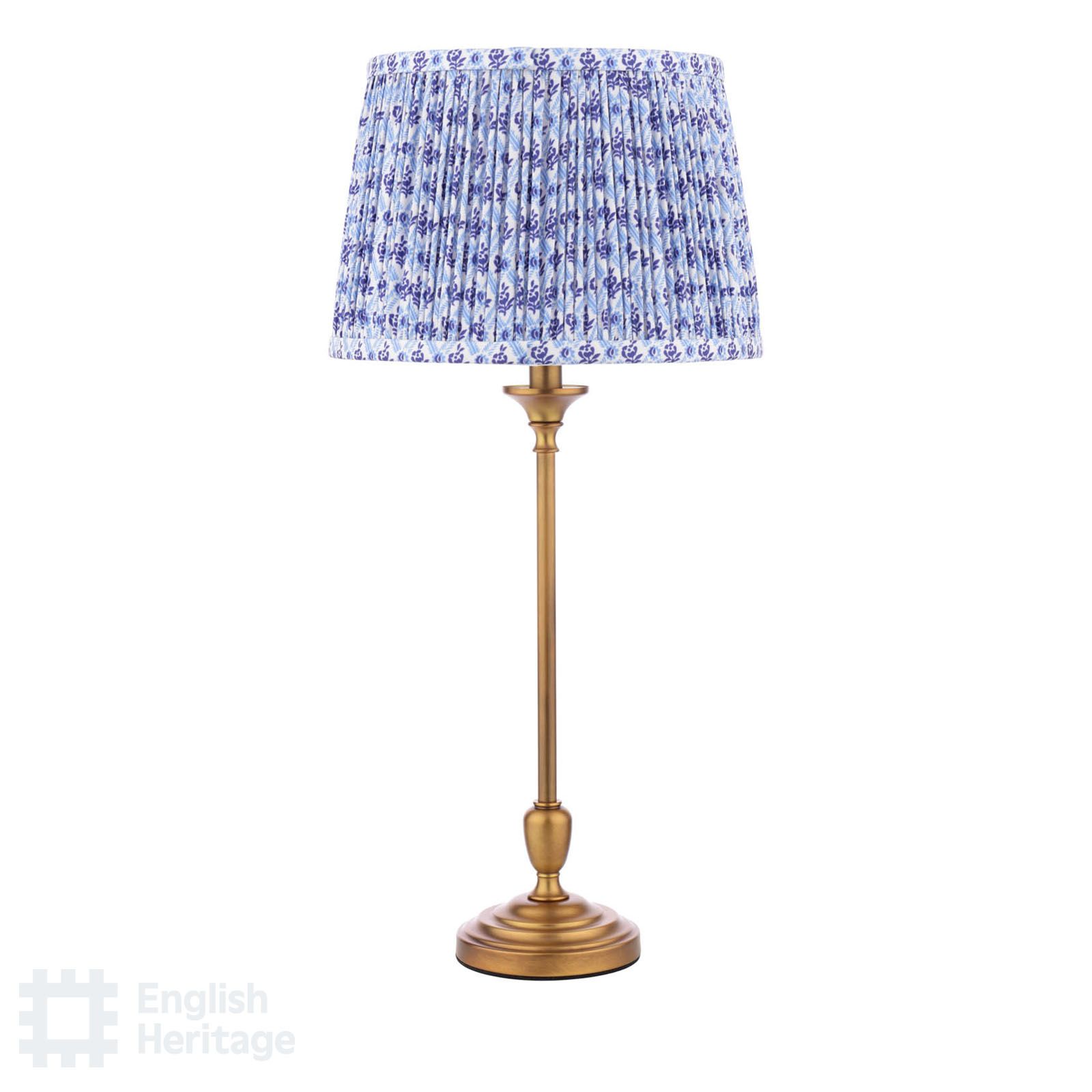 Part of the English Heritage lighting collection, inspired by the historic interiors of Belsay Hall, this elegant table lamp base reflects the quiet elegance and classical proportions found throughout the house. Finished in warm antique brass, the slender stem and weighted base create a refined, timeless profile. Paired with a softly pleated shade inspired by Great British houses and gardens, the design is enriched with decorative heritage detail. Drawn from a historic wallpaper fragment discovered at 80 St John Street, Clerkenwell, the blue trellis pattern frames delicate floral motifs in a block-style print. Together, the base and shade diffuse the light beautifully, bringing warmth, character and understated heritage style to side tables, consoles or bedside settings.