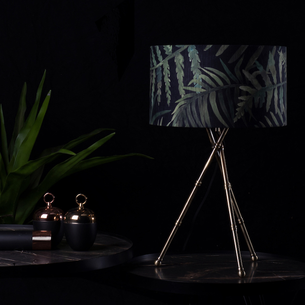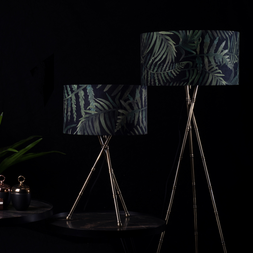 With our Bamboo collection, we’ve taken this trend in a more sophisticated direction with a deep nocturnal palette. The large and small drum shades are inspired by the calm stillness of the forest at night, with a tangle of palm fronds across a deep black background. The tripod base on our table lamp and floor lamp takes the form of bamboo stems in a brass finish, which glints through the darkness for a feeling of luxury. Our Rauma side table and coffee table are the perfect accompaniment for this look with a rich black marble finish.