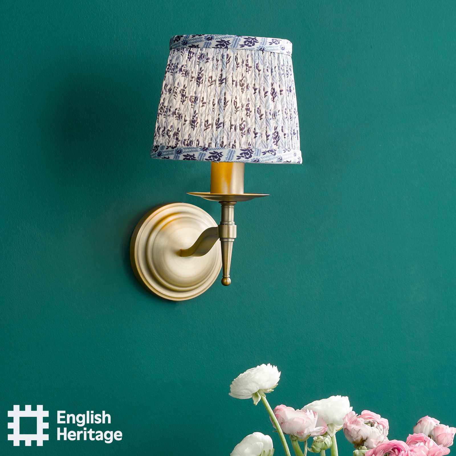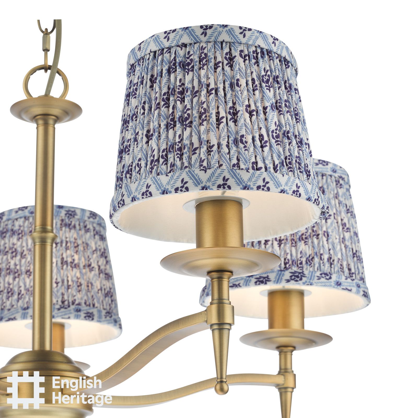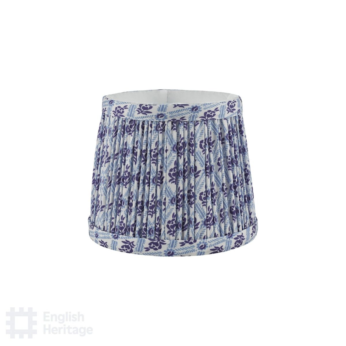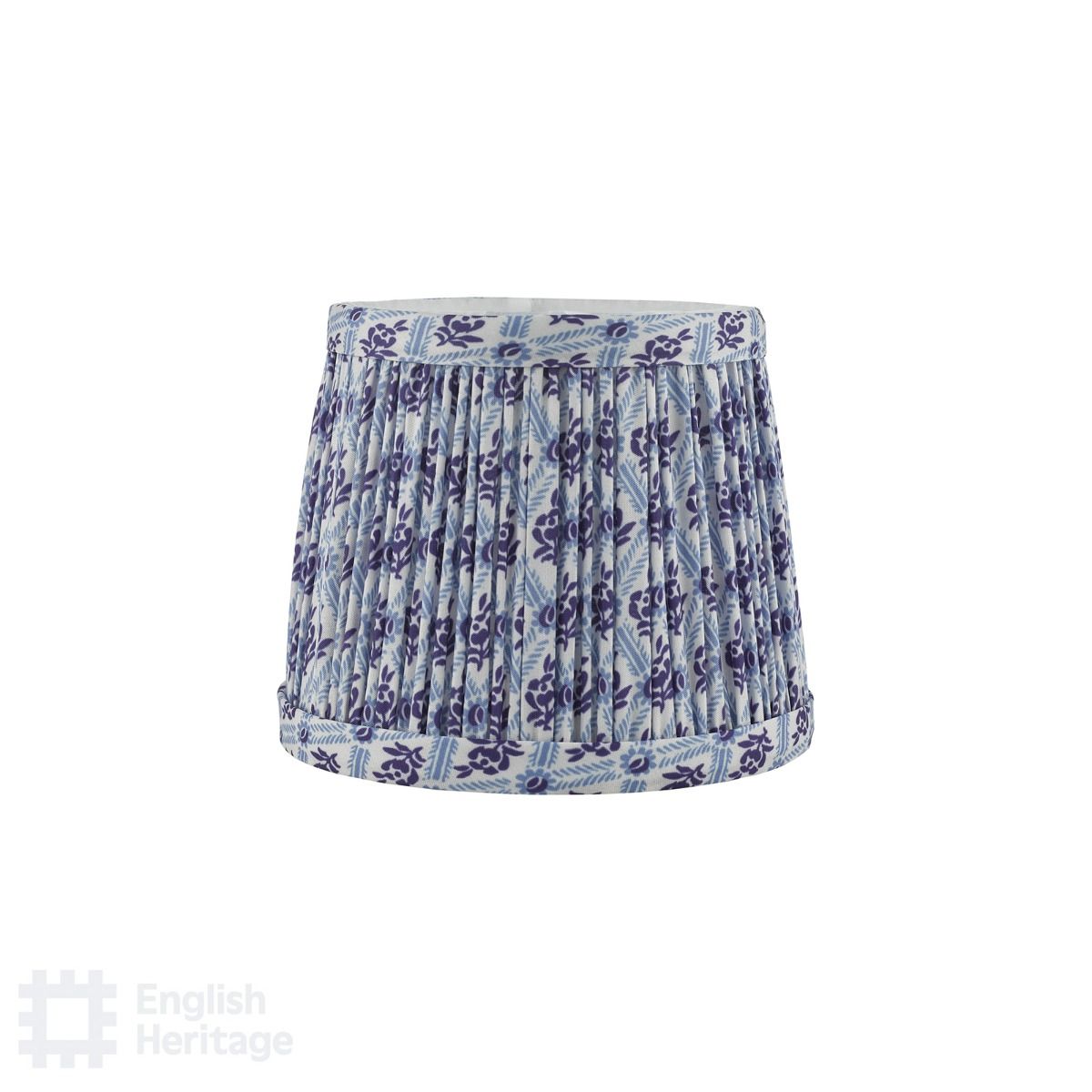 A collection of soft pleated lamp shades taking inspiration directly from a fragment of wallpaper found on the walls of 80 St John Street, Clerkenwell, the blue trellis pattern frames varying floral motifs in a block-style print. This small shade features a E14 (SES) shade ring and is perfect for multi armed pendants or wall lamps such as the Marble Hill 3 light or 5 light pendant. Part of the English Heritage lighting collection, inspired by Great British houses and gardens.