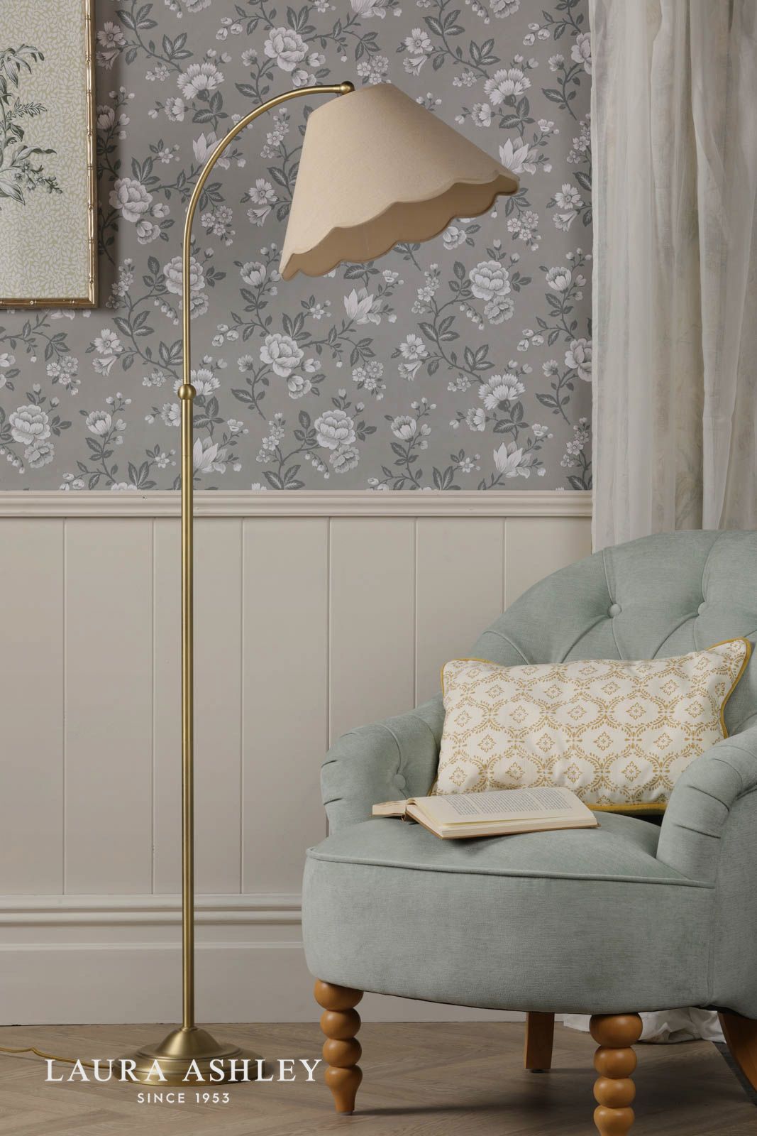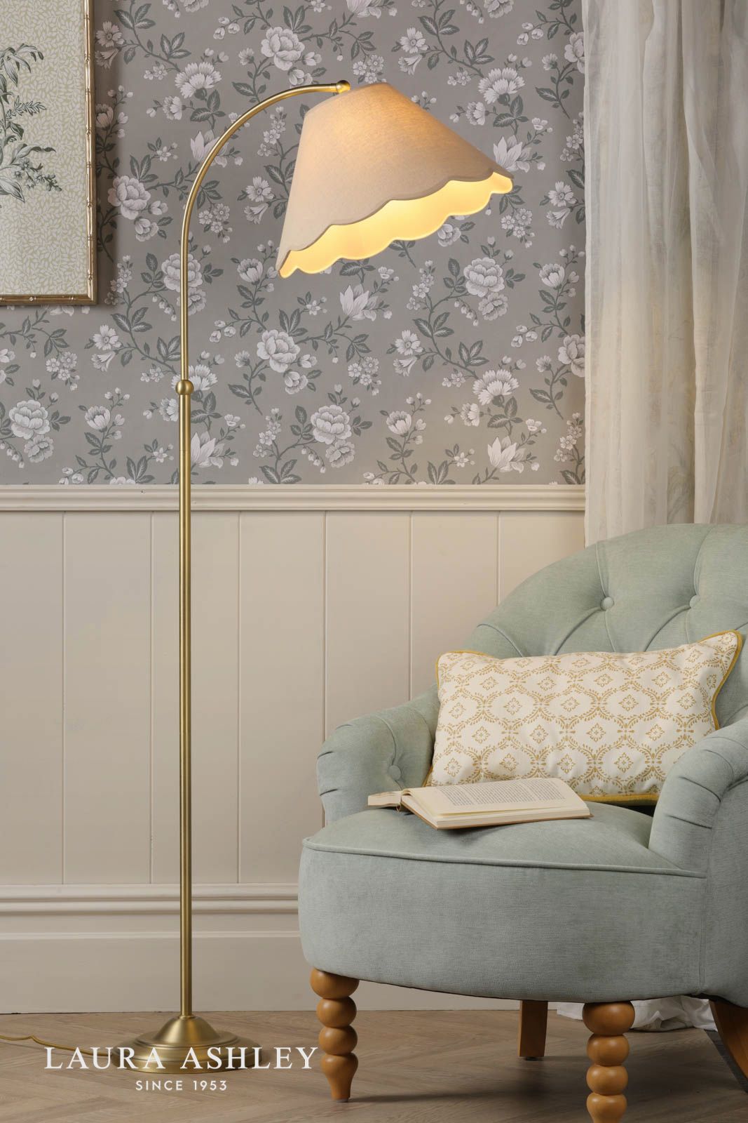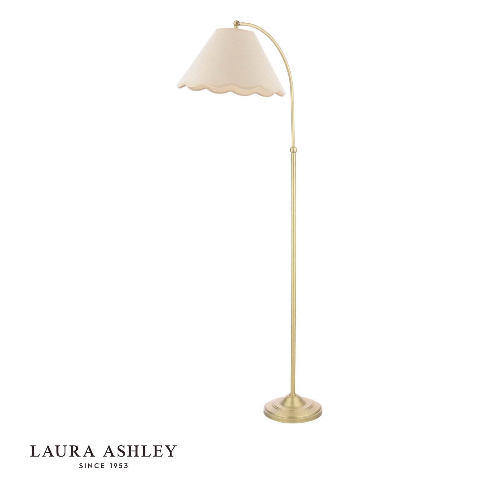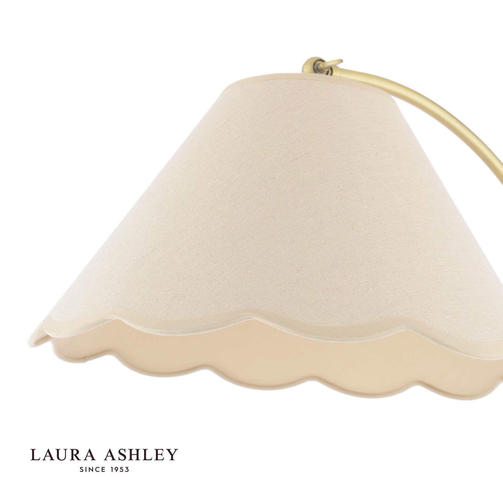This graceful Laura Ashley floor lamp brings timeless sophistication to any living space. The antique brass finish catches light beautifully, while the natural linen shade features delicate scalloped edges that cast enchanting patterns when illuminated. Standing tall and refined, this floor lamp from Laura Ashley artfully balances vintage charm with contemporary elegance. The warm metallic tones of the base complement both modern and traditional decor schemes, making it an versatile lighting choice for your living room. When lit, the textured linen shade diffuses light perfectly, creating a cosy atmosphere that transforms your space from ordinary to extraordinary. It's exactly the sort of thoughtful design detail you'd expect from a heritage brand that's synonymous with British style.