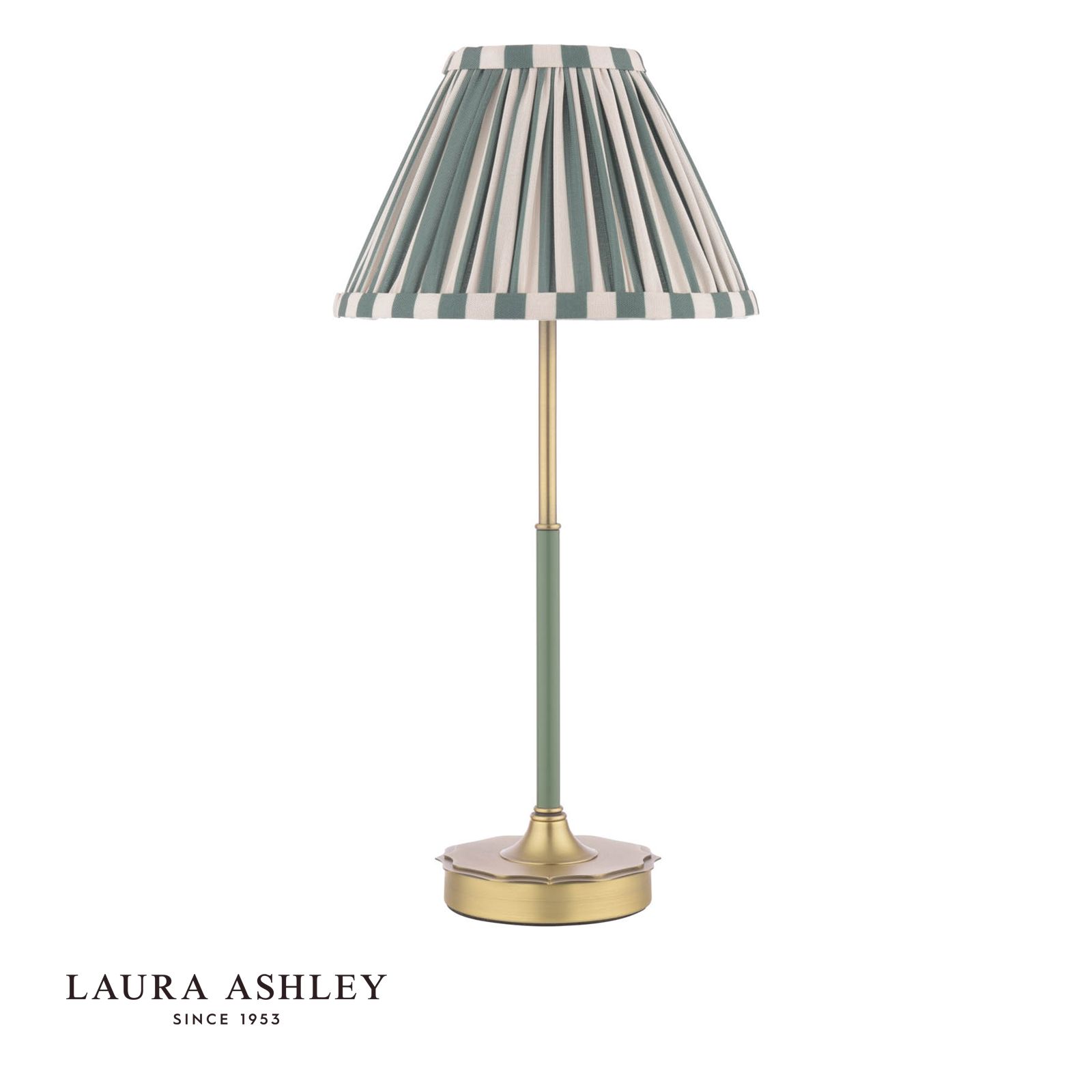 Timeless design meets modern lighting versatility with this Laura Ashley table lamp. An antique brass base provides the perfect foundation for the green striped shade, recreating that vintage look you adore. Whether it's the living room, hallway or bedroom, this lamp makes a stylish addition to any space. Simply place it atop a side table or console for an instant ambiance boost. Laura Ashley's signature elegant flair allows this lamp to blend effortlessly into your existing decor while also serving as a focal point. Illuminate your home in true British style.