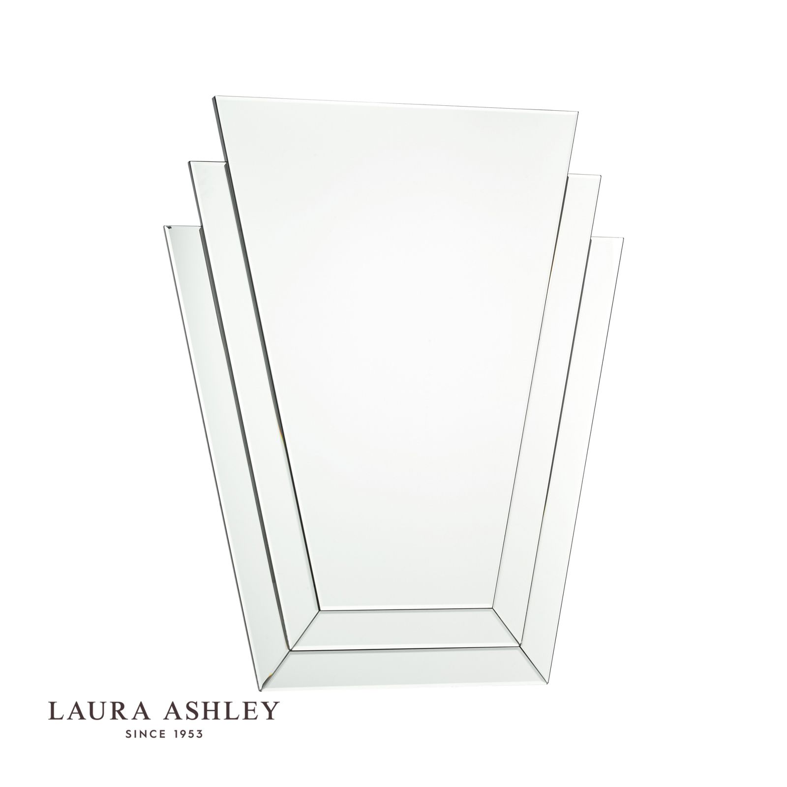 Rock the Great Gatsby look with the Duchess Art Deco mirror from Laura Ashley. A decorative, slightly fan shape in bevelled mirror gives the illusion of multiple layers echoing the forms of rising skyscrapers. The frameless design gives a sleek, modern look with slender matt black edging. This mirror can only be arranged in portrait format as shown. Not suitable for bathroom or outdoor use.