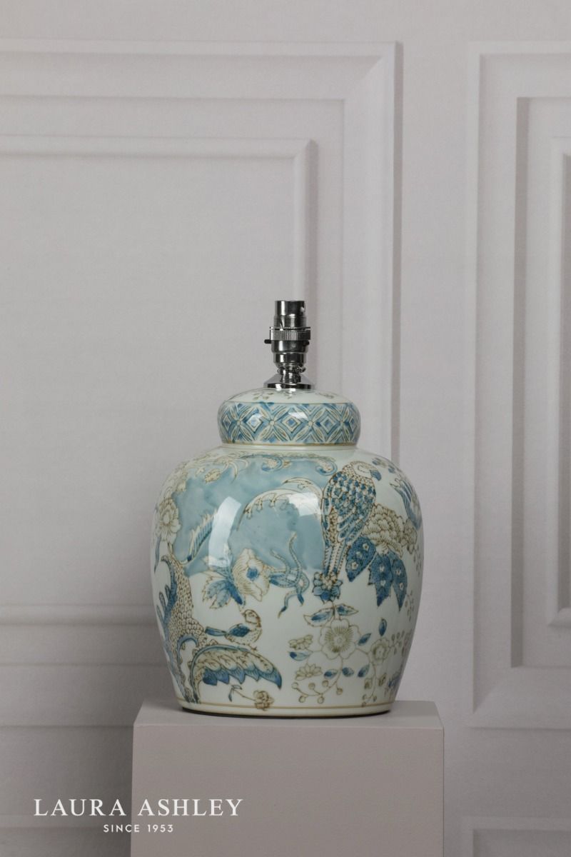 The hand-painted Elizabeth table light from Laura Ashley portrays a delightful scene of birds and foliage, in muted blues and browns. Shaped like a Chinese ginger jar, the ceramic base has a gloss finish and is topped by a bright polished chrome lampholder.