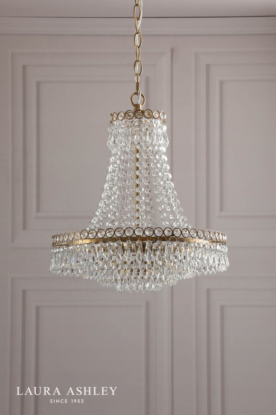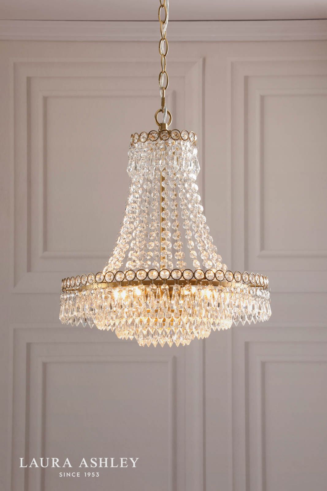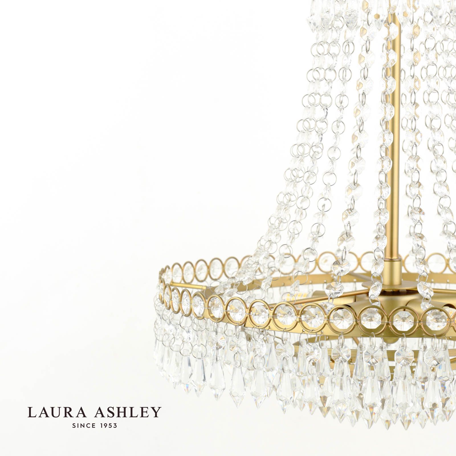 Discover classic elegance with Laura Ashley’s Enid Chandelier. Delicate crystals hang from rings to form this beautiful pendant, an eye-catching centrepiece that is an effortlessly sophisticated lighting option that is always in style. With a cascade of crystal beads flowing downwards and outwards from a narrow circlet to a wider one, from which are suspended cut droplets in ever-decreasing circles, this French-influenced ceiling light is made of clear, cut crystal, hand polished to give a smooth surface, on a metal frame finished with matt antique brass.