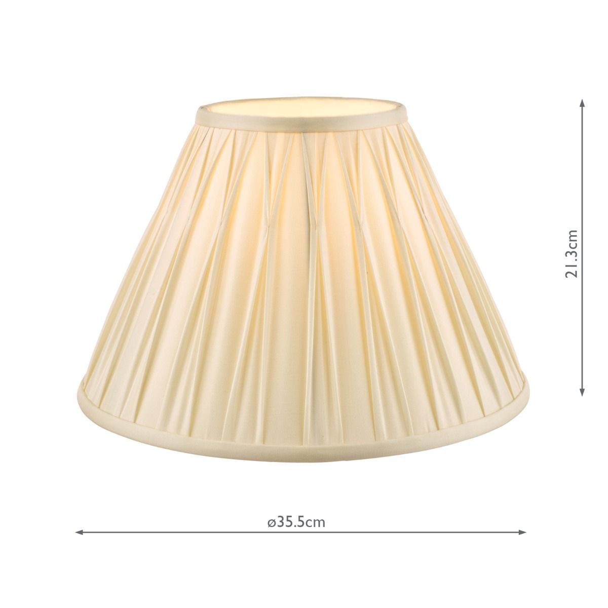 The Laura Ashley Fenn lightshade has a classic, slightly angled, Empire drum form. The diameter of this size is 35cm. Here we finish it in an elegant, pinched pleat smooth silk in ivory.