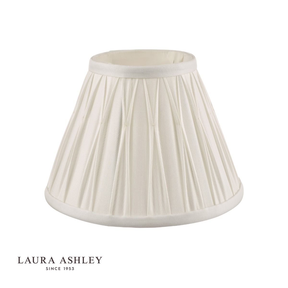 The Laura Ashley Fenn lightshade has a classic, slightly angled, Empire drum form. The diameter of this size is 20cm. Here we finish it in an elegant, pinched pleat smooth silk in white.