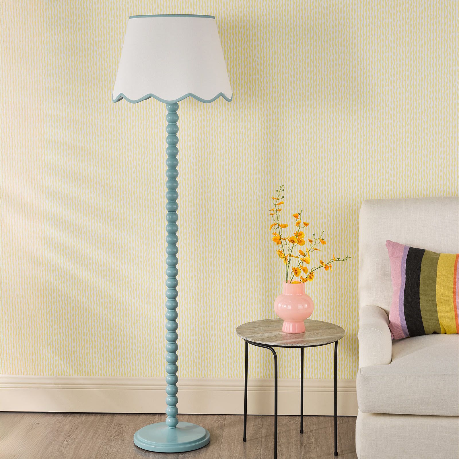 Make a statement with the Spool Floor Lamp paired with the Poma Shade – a striking blend of colour, form and natural texture. The tall, sculptural bobbin-style base in a stricking blue hue brings playful character and modern charm, while the Poma Shade in natural linen with a blue scalloped edge adds soft texture and Boho-inspired elegance. Perfect for living rooms, reading corners or bedrooms, this floor lamp creates a warm, inviting glow and a touch of artistic flair. A beautifully balanced design that combines contemporary colour with timeless craftsmanship.