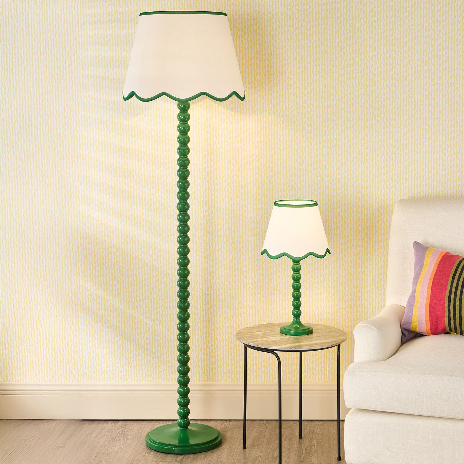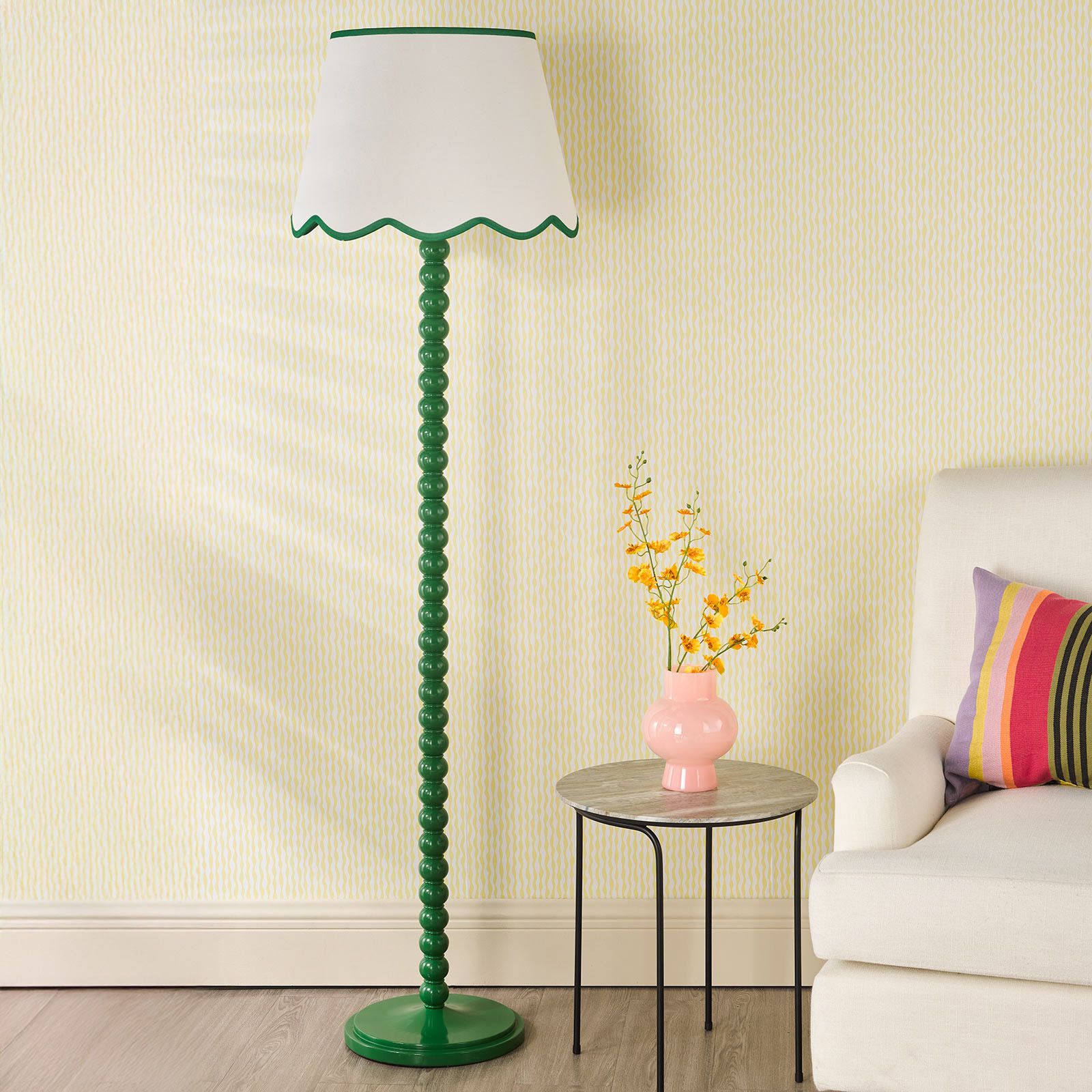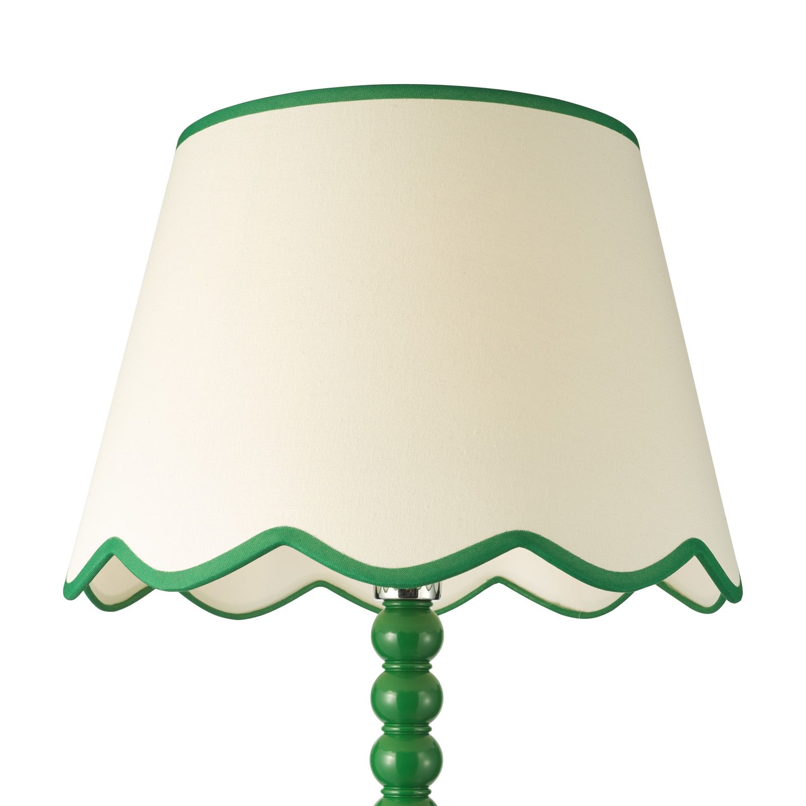 Make a statement with the Spool Floor Lamp paired with the Poma Shade – a striking blend of colour, form and natural texture. The tall, sculptural bobbin-style base in a stricking green hue brings playful character and modern charm, while the Poma Shade in natural linen with a green scalloped edge adds soft texture and Boho-inspired elegance. Perfect for living rooms, reading corners or bedrooms, this floor lamp creates a warm, inviting glow and a touch of artistic flair. A beautifully balanced design that combines contemporary colour with timeless craftsmanship.