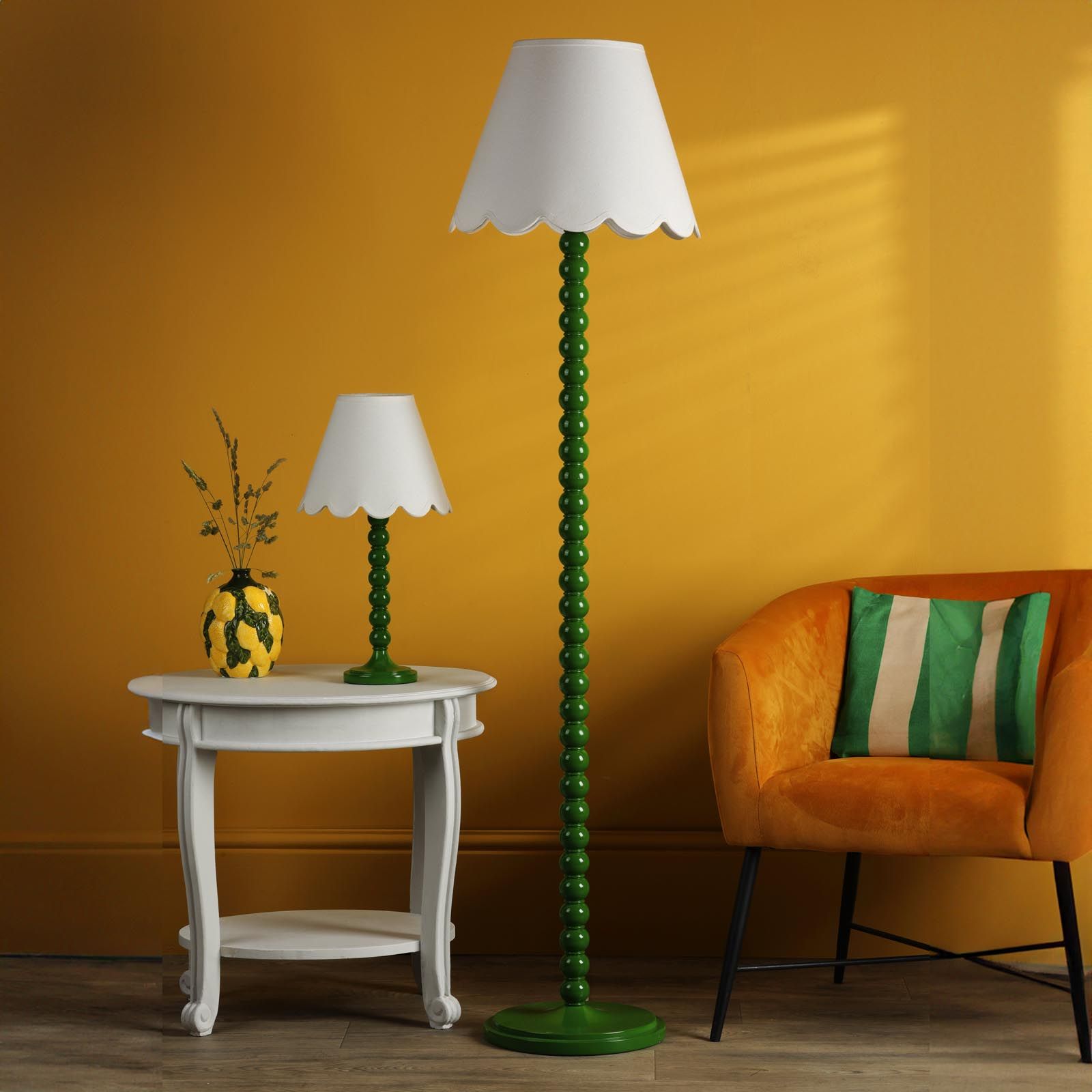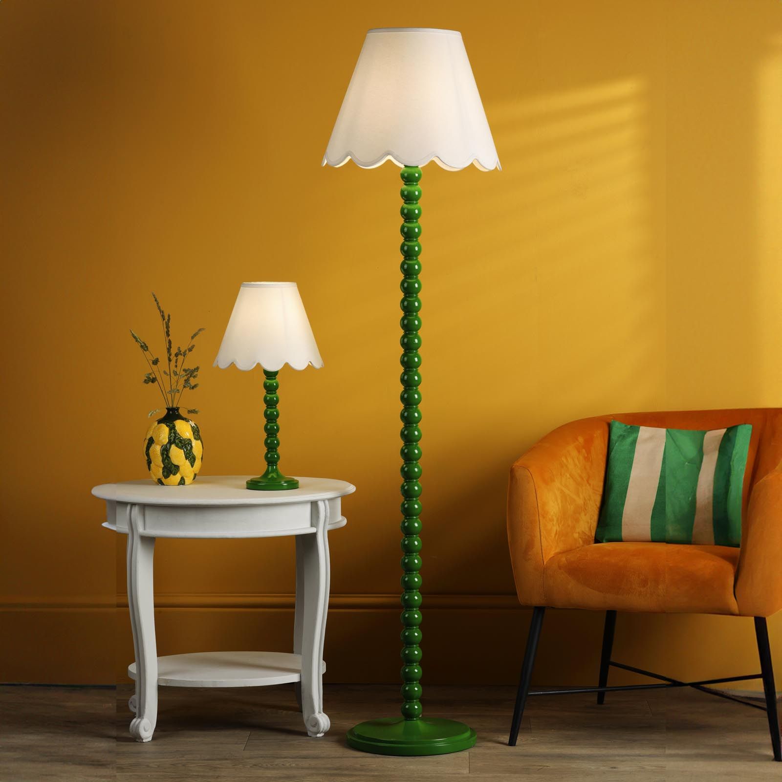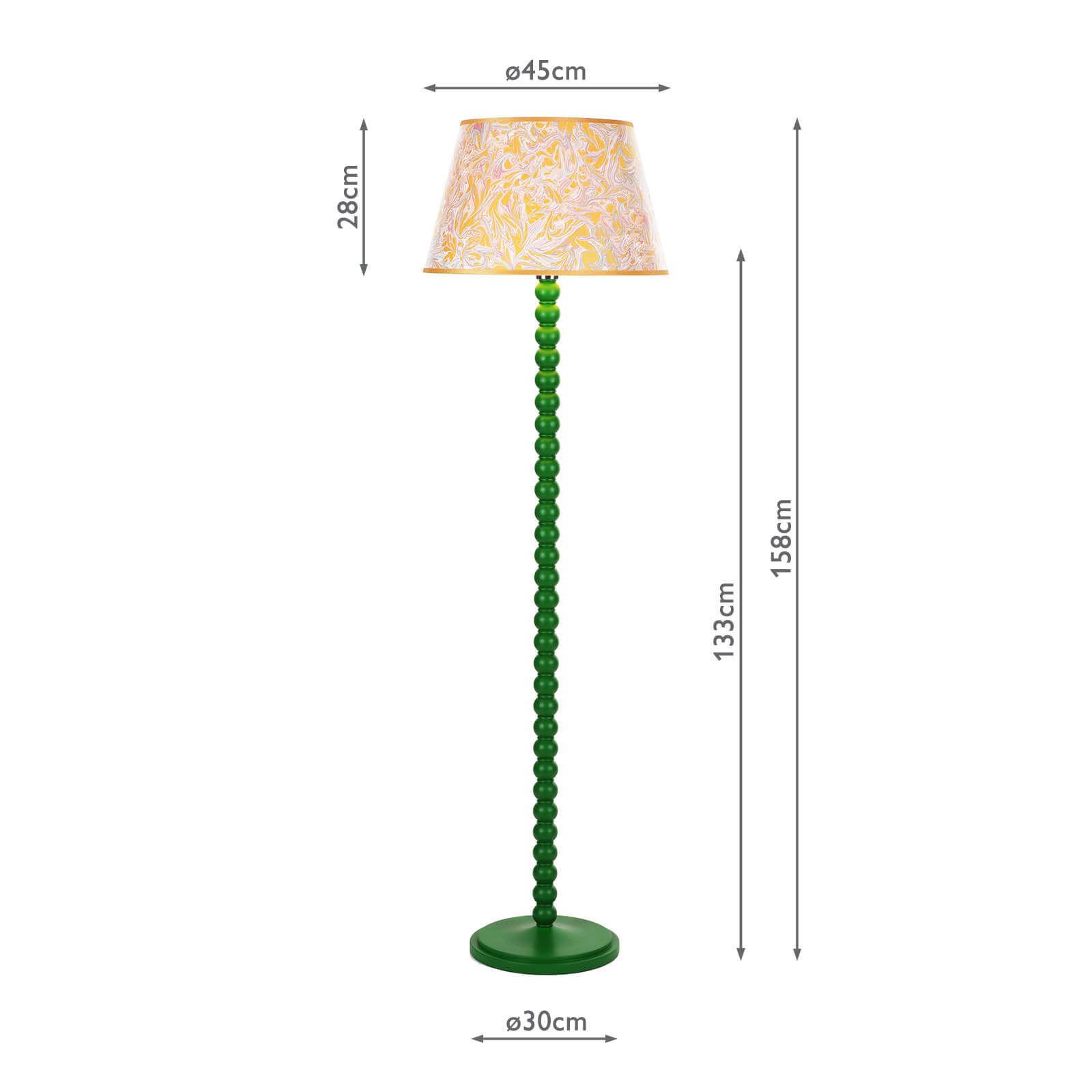 Inspired by the bobbin legs of the Arts and Crafts movement, this lamp boasts a vibrant gloss green base that exudes a lively energy. Designed for convenience, the floor lamp features a white braided cable and a foot switch for easy operation. Whether placed beside your favorite armchair or adding flair to your kitchen, the Spool Floor Lamp effortlessly combines function and style.