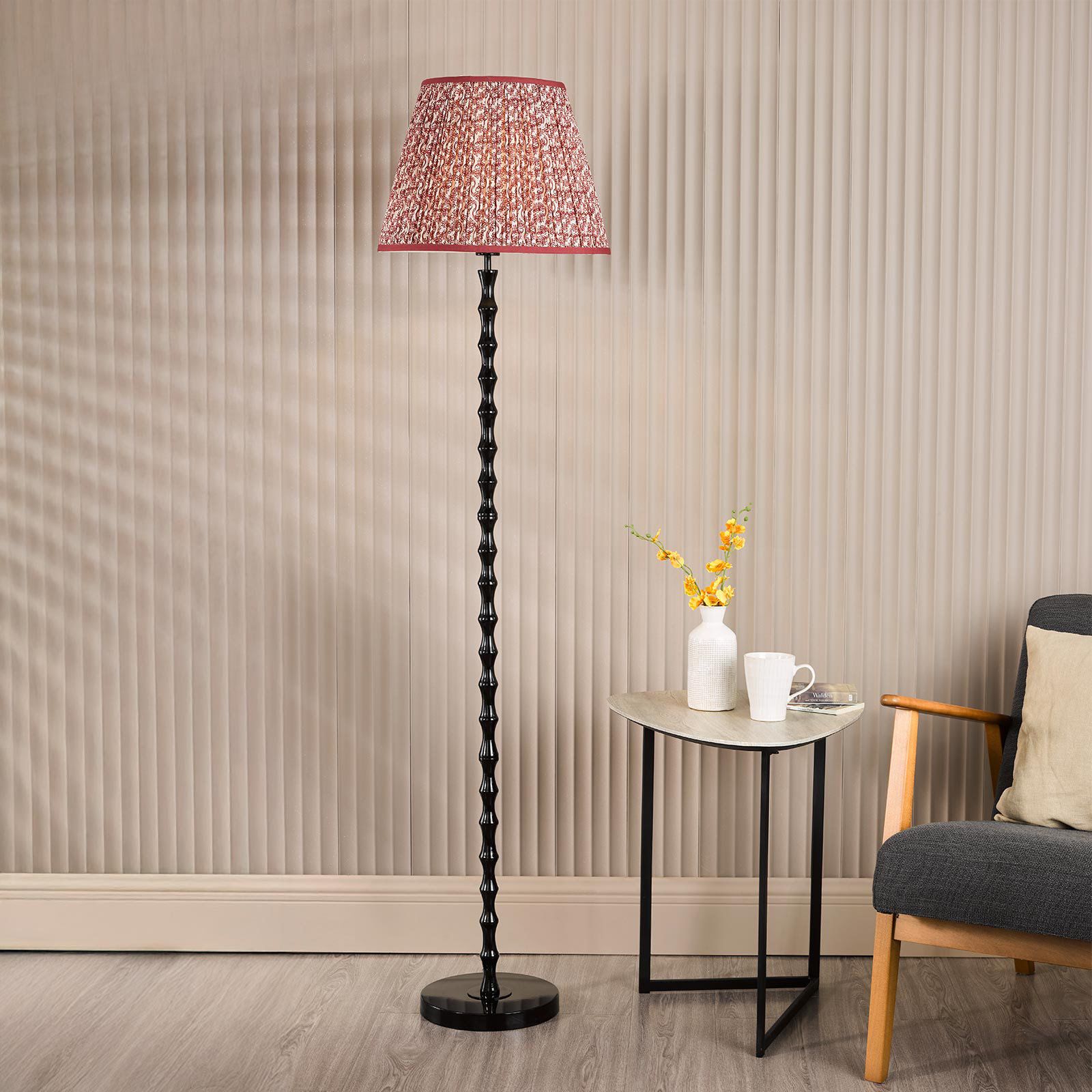 The Siyanda Floor Lamp base combines contemporary classic styling with versatile appeal. Finished in high-gloss black, its elongated bamboo-inspired steel stem brings elegance, quality and presence. A luxury black braided cable with convenient floor switch adds refined practicality. Perfect for living rooms, bedrooms, dining areas, kitchens or hallways, Siyanda adapts beautifully to a wide range of shades – from natural linens to bold patterns – creating layered lighting and a personalised style statement with warmth, character and sophistication.