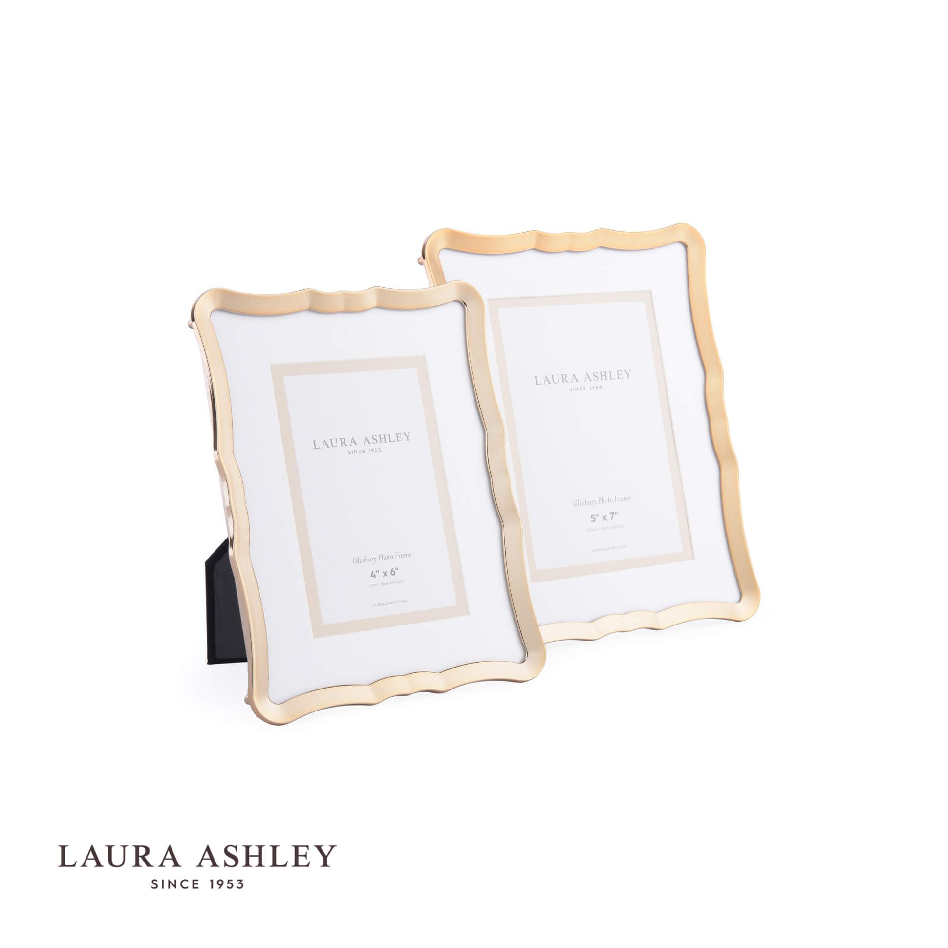Drawing on Art Nouveau, with its sinuous curves in gorgeous tones of gold the Glasbury photograph frame from Laura Ashley is an object to be treasured for itself, as well as for the moment-in-time it displays. Holds one photo. Free standing, for both portrait or landscape orientation. The frame is silver-plated metal, glass fronted, with a black velvet backing.