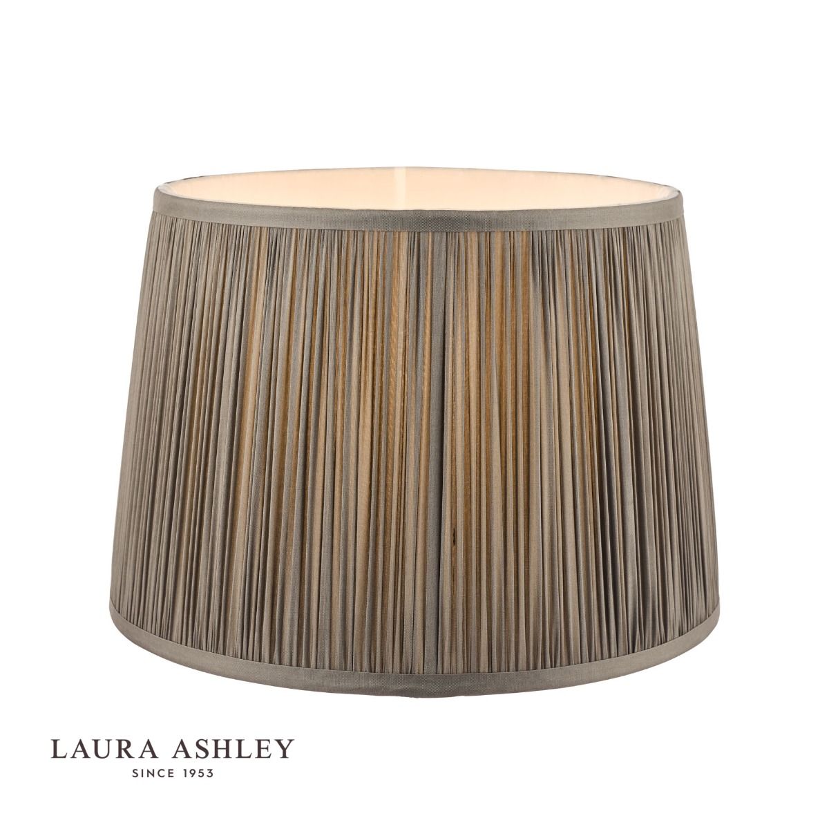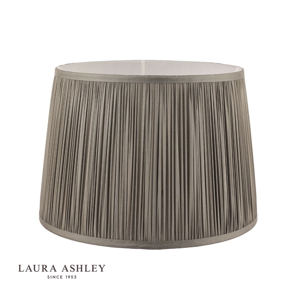 The Laura Ashley Hemsley lightshade has a classic, slightly angled, Empire drum form. The diameter of this size is 25cm. Here we finish it in an elegant, pleated smooth silk in grey.