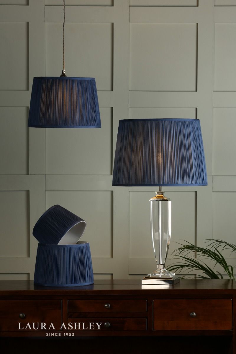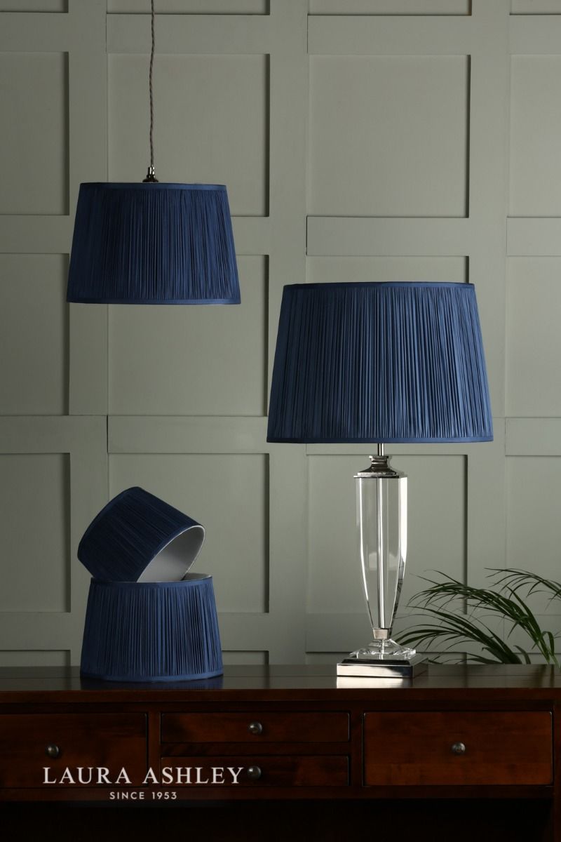 The Laura Ashley Hemsley lightshade has a classic, slightly angled, Empire drum form. The diameter of this size is 25cm. Here we finish it in an elegant, pleated smooth silk in midnight blue.