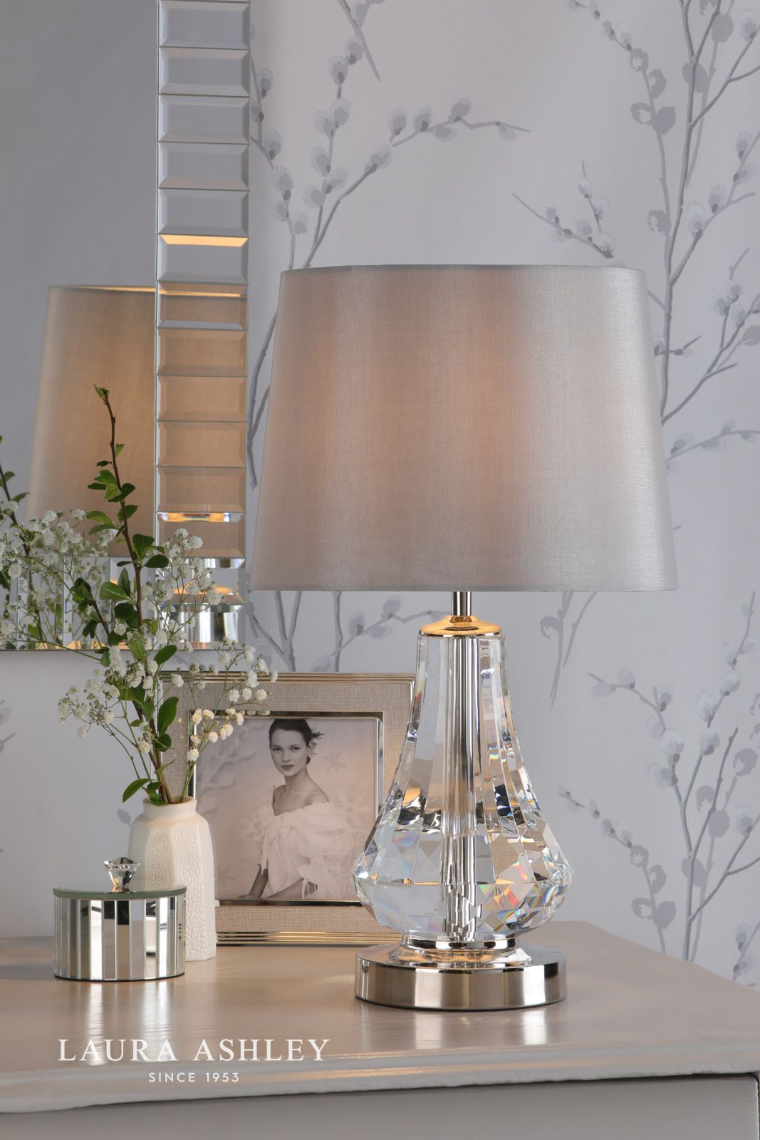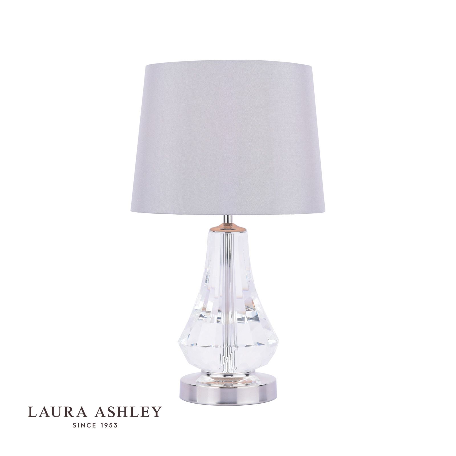 The Humby Table Lamp by Laura Ashley features stunning sparkly cut glass paired with polished finished metal and a contemporary touch on/off function. Simply touch the polished nickel base once to turn on and again to turn off.This touch lamp is a perfect bedside lamp adding a touch of glamour to your room. Expertly paired with a silver faux silk shade and luxury reflective silver inner to diffuse the light.