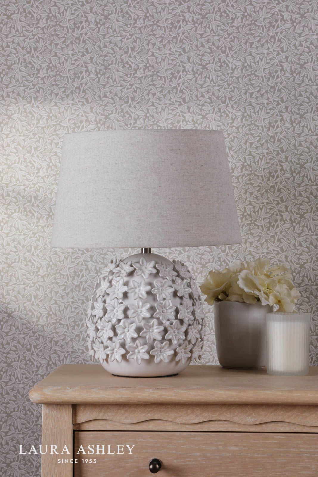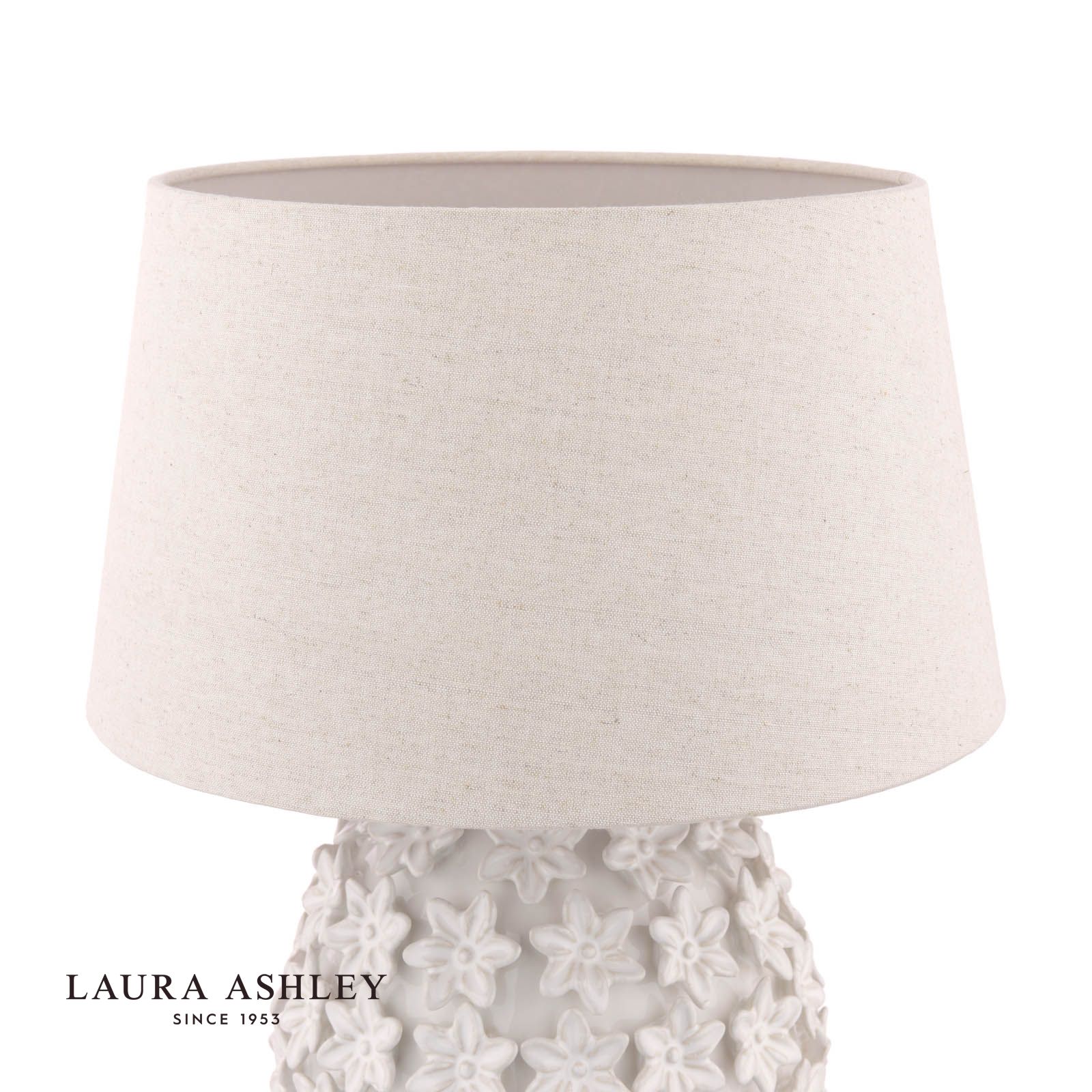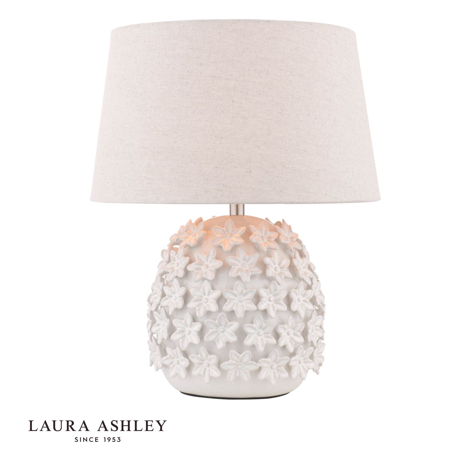 Bask in the warm, inviting glow of this Ingham table lamp from Laura Ashley. Its off-white ceramic base features the brand's signature romantic floral pattern, beautifully illuminated by a natural lamp shade. Place this classic yet modern piece on a side table or console to lend an elegant, cosy ambiance to your living room. Or let it light the way in a hallway or entryway, welcoming you home with soft, diffused lighting. The Ingham lamp's timeless style complements traditional and contemporary decor alike. Laura Ashley's expertise shines through in the intricate details and quality craftsmanship. Elevate your home with this effortlessly stylish table lamp.
