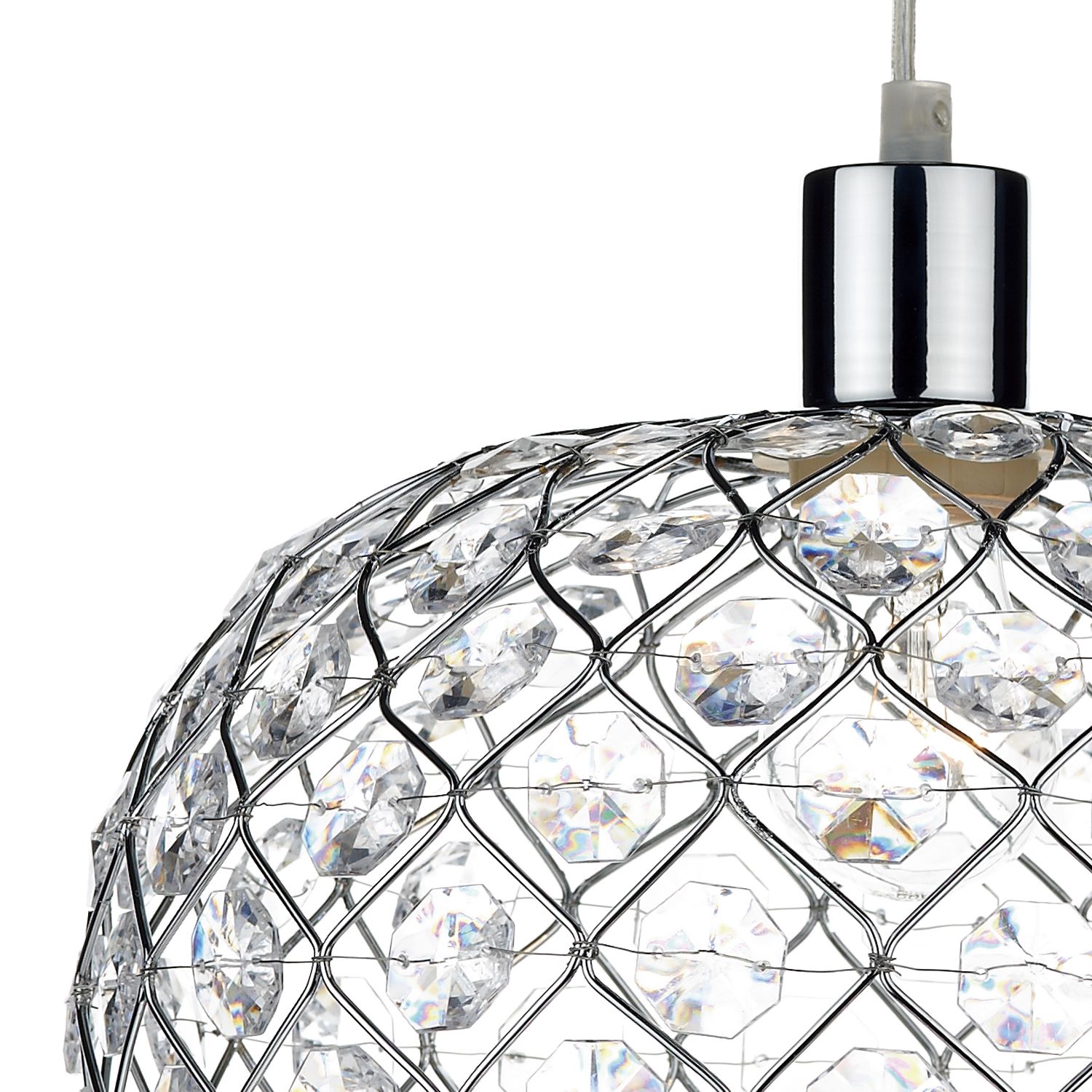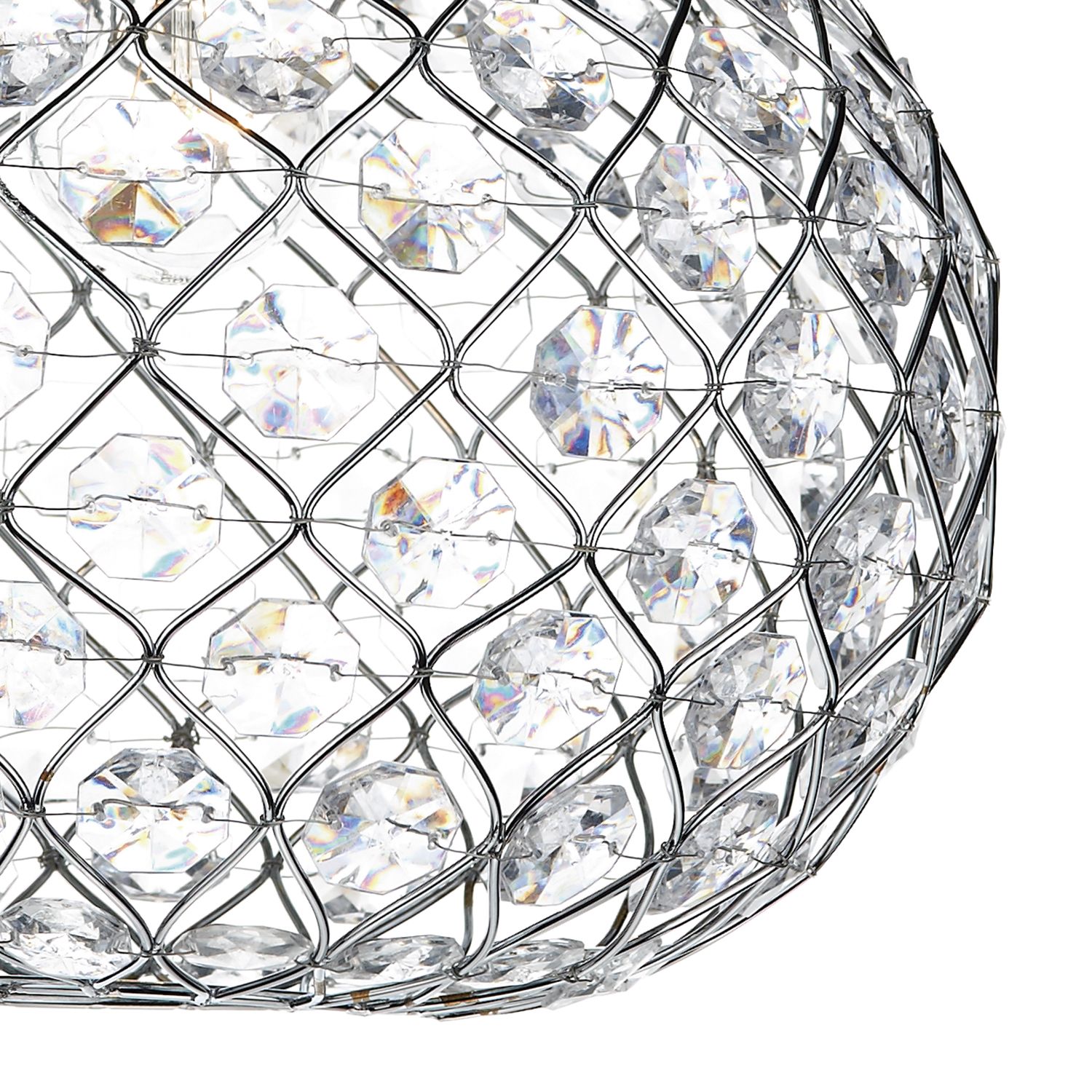 The Juanita Easy Fit Pendant adds instant glamour with a polished chrome frame adorned in faceted acrylic beads that sparkle beautifully when lit. Ideal for living rooms, bedrooms or dining areas, this shade fits onto your existing ceiling pendant for a quick and stylish refresh. The chrome finish enhances both modern and traditional interiors, transforming your room into a dazzling focal point in minutes.