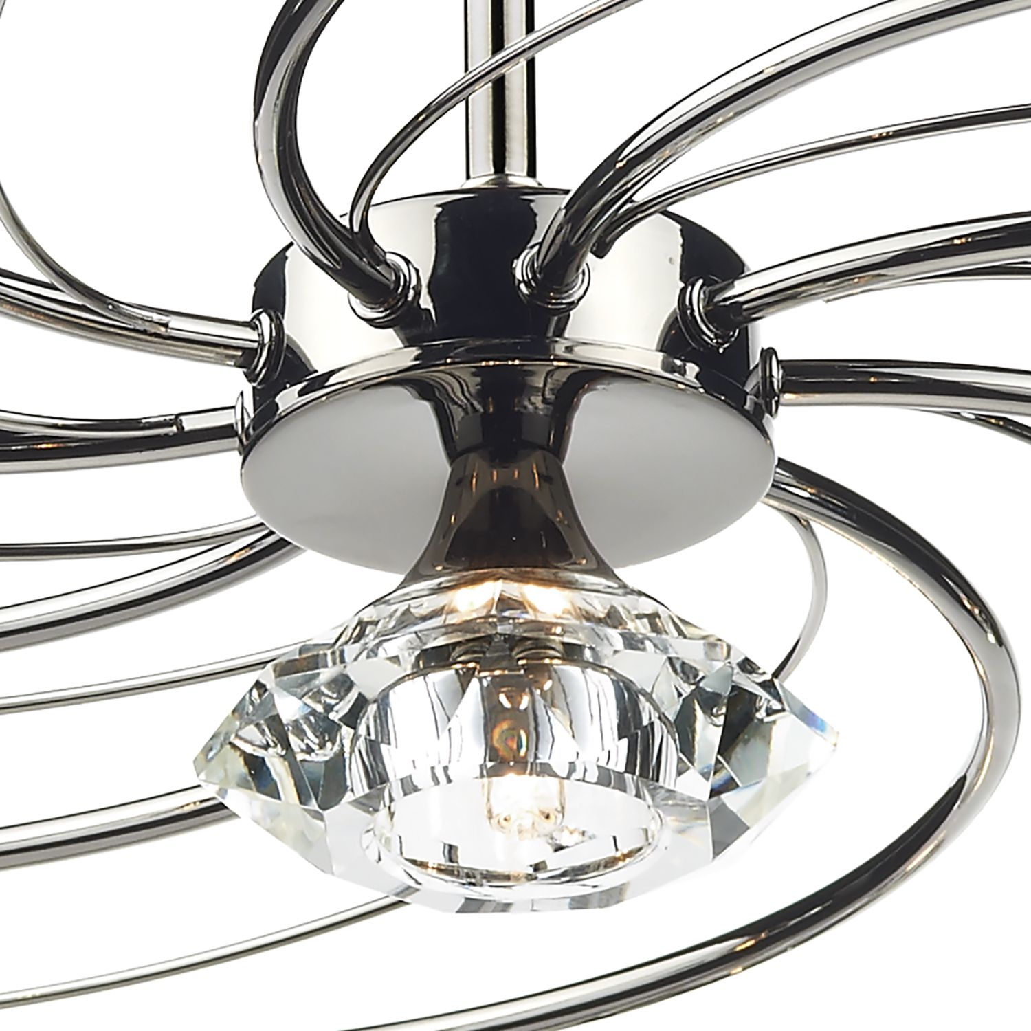 The Luther 10 Light Semi Flush Ceiling Light brings statement sparkle to interiors with its flowing, contemporary design. Finished in black chrome, sweeping arms extend outward to support faceted crystal glass shades that catch and reflect the light beautifully. Designed to sit close to the ceiling, Luther is ideal for rooms where impact is needed without excessive drop. Perfect for living spaces or larger bedrooms, it delivers generous illumination with a refined, decorative finish.