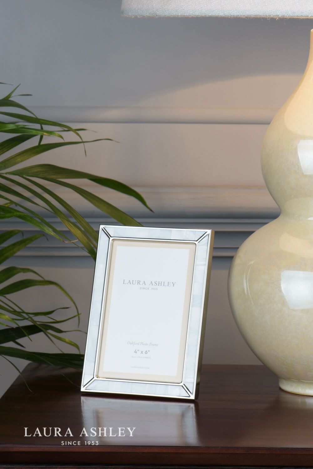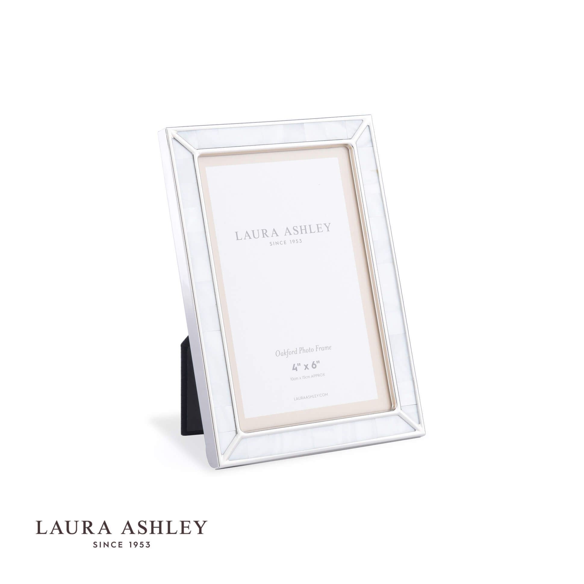 Perfect for displaying your most treasured image, the face of the Oakford photograph frame from Laura Ashley is decorated with inlaid iridescent shell. A hand-made, Arts & Crafts look is created by the stained-glass type metalwork. Holds one photo. Free standing, for both portrait or landscape orientation. The frame is nickel-plated steel, glass fronted, with a black velvet backing.